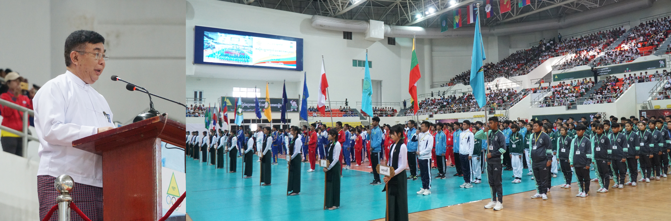 ရှေးဦးစွာ ပညာရေးဝန်ကြီးဌာန ပြည်ထောင်စုဝန်ကြီး ဒေါက်တာညွန့်ဖေက အခြေခံပညာကျောင်းသား အားကစားပွဲတော်တွင် ဘောလုံး(အမျိုးသား/အမျိုးသမီး)၊ ဘော်လီဘော (အမျိုးသား/ အမျိုးသမီး)၊ ပြေးခုန်ပစ် (အမျိုးသား/အမျိုးသမီး)နှင့် ပိုက်ကျော် ခြင်း (အမျိုးသား) အားကစားနည်းများကို ကျင်းပပေးသွားမည်ဖြစ်ပါကြောင်း၊ အားကစားဆို သည်မှာ “အနိုင်အရှုံးတစ်ခုတည်းကို ယှဉ်ပြိုင်တာမျိုး မဟုတ်ဘဲ ဇွဲရှိမှု၊ သည်းခံမှု၊ ကျွမ်းကျင်မှု၊ စိတ်ဓာတ်ကြံ့ခိုင်မှု၊ စည်းလုံး ညီညွတ်မှု၊ စည်းကမ်းဥပဒေကို ရိုသေလေးစား လိုက်နာမှု၊ ယဉ်ကျေးမှု” စသည်တို့ကိုပါ ယှဉ်ပြိုင်ခြင်းဖြစ်ပါကြောင်း၊ နိုင်ငံတကာ အားကစား ပြိုင်ပွဲများတွင် အောင်မြင်မှုရရှိခြင်းသည် နိုင်ငံတော်၏ စည်းလုံးညီညွတ်မှု၊ ဂုဏ်သိက္ခာနှင့် မျိုးချစ်စိတ်တို့ကို ဖော်ဆောင်နိုင်ခြင်းဖြစ်ပါကြောင်း၊ ယခုကျင်းပသည့် အခြေခံပညာ ကျောင်းသားအားကစား ပွဲတော်ကြီးတွင်ပါဝင်ယှဉ်ပြိုင်ကြမည့် အားကစားမောင်မယ်များအနေဖြင့် နိုင်ငံတော်၏ဂုဏ်သိက္ခာကို ဖော်ဆောင်နိုင်သော နိုင်ငံ့လက်ရွေးစင်အားကစား သမားများဖြစ်လာအောင် ကြိုးစားကြရန်ကိုလည်း မှာကြားလိုပါကြောင်း။