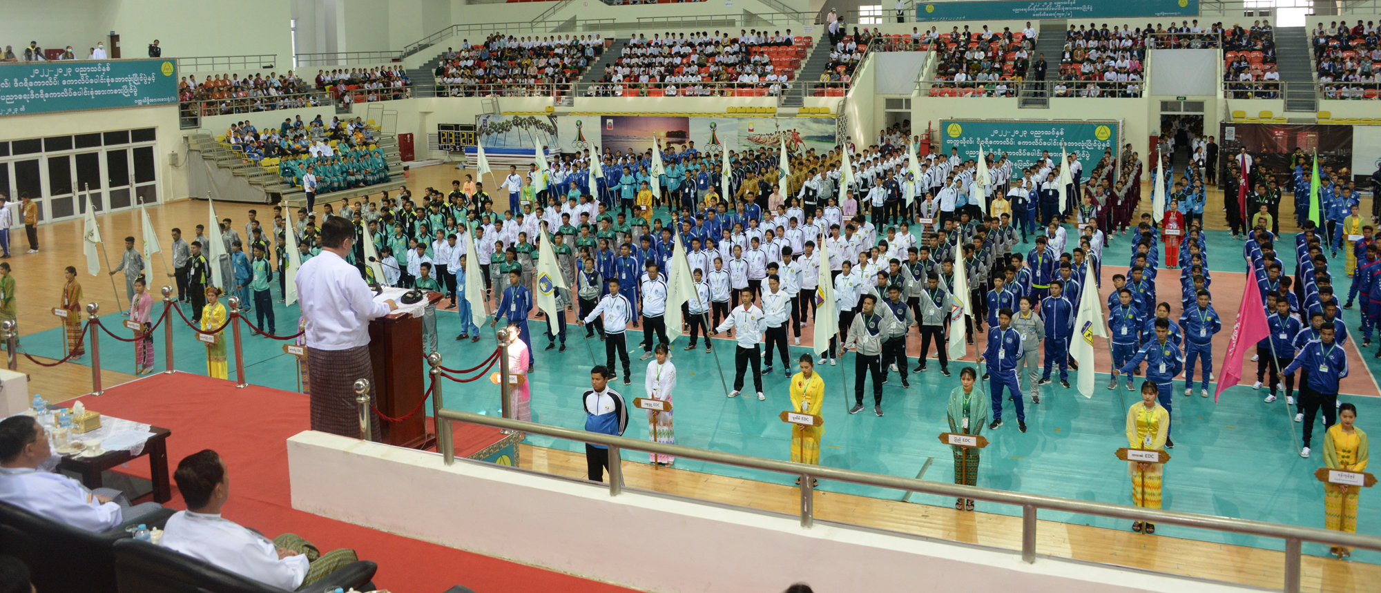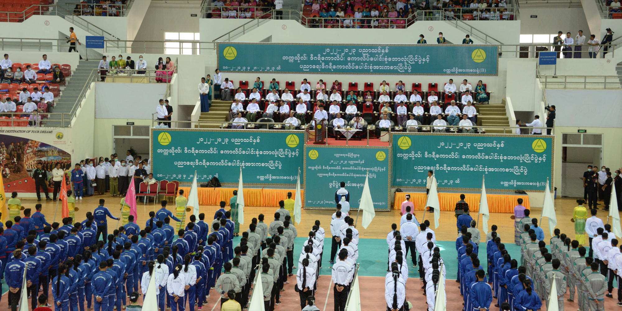 ပညာရေးဝန်ကြီးဌာန အဆင့်မြင့်ပညာဦးစီးဌာန တက္ကသိုလ်၊ ဒီဂရီကောလိပ်၊ ကောလိပ် ပေါင်းစုံ ဘောလုံးပြိုင်ပွဲနှင့် ဆရာအတတ်ပညာဦးစီဌာန ပညာရေးဒီဂရီကောလိပ်ပေါင်းစုံ အားကစားပြိုင်ပွဲ ဖွင့်ပွဲအခမ်းအနားကို ယနေ့မွန်းလွဲပိုင်းတွင် နေပြည်တော် ဝဏ္ဏသိဒ္ဓိ အားကစားရုံ(B)၌ကျင်းပရာ နိုင်ငံတော်စီမံအုပ်ချုပ်ရေးကောင်စီဝင်များ၊ ပြည်ထောင်စုဝန်ကြီး များ၊ နေပြည်တော်ကောင်စီဥက္ကဋ္ဌ၊ ဒုတိယဝန်ကြီးများ၊ အမြဲတမ်းအတွင်းဝန်များ၊ တာဝန်ရှိသူ များ၊ အားကစားသမားများနှင့် ကျောင်းသား ကျောင်းသူများ တက်ရောက်ကြသည်။