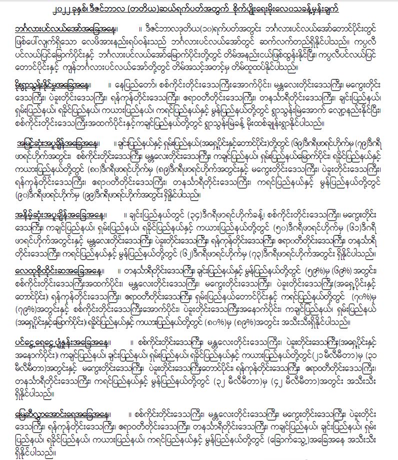 မိုးရွာသွန်းနိုင်မှုအခြေအနေ။ ။ နေပြည်တော်၊ စစ်ကိုင်းတိုင်းဒေသကြီးအောက်ပိုင်း၊ မန္တလေးတိုင်းဒေသကြီး၊ မကွေးတိုင်း ဒေသကြီး၊ ပဲခူးတိုင်းဒေသကြီး၊ ရန်ကုန်တိုင်းဒေသကြီး၊ ဧရာဝတီတိုင်းဒေသကြီး၊ တနင်္သာရီတိုင်းဒေသကြီး၊ ချင်းပြည်နယ်၊ ရှမ်းပြည်နယ်၊ ရခိုင်ပြည်နယ်၊ ကယားပြည်နယ်၊ ကရင်ပြည်နယ်နှင့် မွန်ပြည်နယ်တို့တွင် ရွာသွန်းမြဲအောက် လျော့နည်းနိုင်ပြီး၊ စစ်ကိုင်းတိုင်းဒေသကြီးအထက်ပိုင်းနှင့်ကချင်ပြည်နယ်တို့တွင် ရွာသွန်းမြဲခန့် မိုးထစ်ချုန်းရွာနိုင်ပါသည်။
