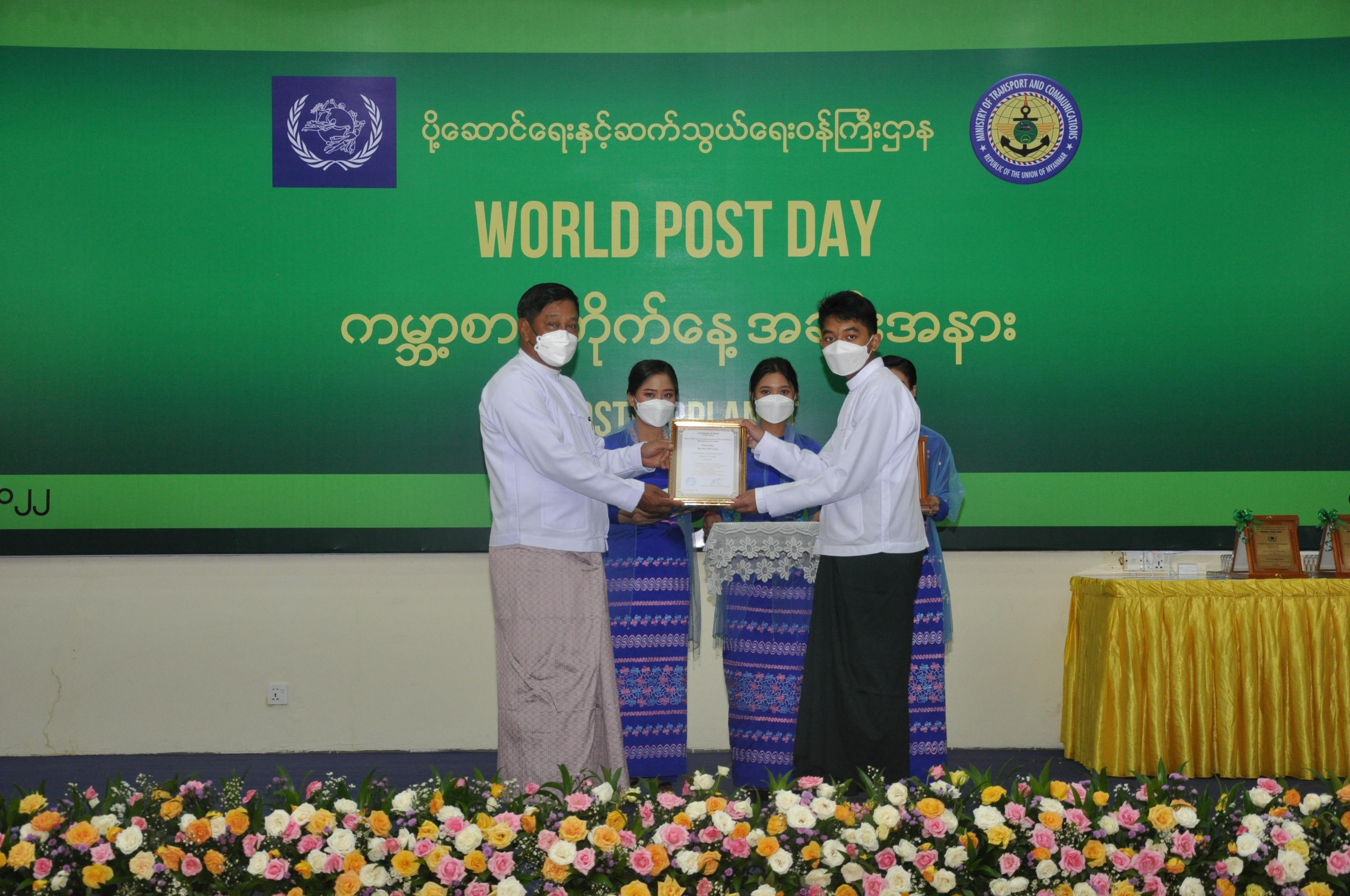 ယင်းနောက် ကမ္ဘာ့စာပို့တိုက်နေ့အထိမ်းအမှတ်အခမ်းအနားတွင် (၅၁) ကြိမ်မြောက် အသက်(၁၅)နှစ် နှင့်အောက် နိုင်ငံတကာလူငယ်များ ပေးစာရေးပြိုင်ပွဲ (ပြည်တွင်းအဆင့်)၌ ပထမဆုရရှိသော နေပြည်တော်ပြည်ထောင်စုနယ်မြေ၊ ဇမ္ဗူသီရိမြို့နယ်မှ မောင်မိုးထက်အောင်၊ ဒုတိယဆုရရှိသော နေပြည်တော်ပြည်ထောင်စုနယ်မြေ၊ ပျဉ်းမနားမြို့မှ မသက်မှူးခင်၊ တတိယဆုရရှိသော မကွေးတိုင်း ဒေသကြီး၊ မကွေးမြို့မှ မခင်ခင်ဦးသာနှင့်အထူးဆုရရှိသူ (၂)ဦးတို့ကို ပြည်ထောင်စုဝန်ကြီးက ဂုဏ်ပြုဆုများပေးအပ် ချီးမြှင့်သည်။