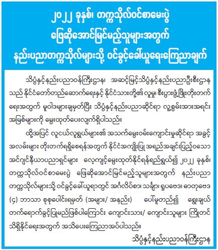 ၂၀၂၂ ခုနှစ်၊ တက္ကသိုလ်ဝင်စာမေးပွဲ ဖြေဆိုအောင်မြင်မည့်သူများအတွက် နည်းပညာတက္ကသိုလ်များသို့ ဝင်ခွင်ခေါ်ယူရေးကြေညာချက်