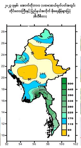 မိုးရွာရက်အနေဖြင့်- ပဲခူးတိုင်းဒေသကြီး၊ ရန်ကုန်တိုင်းဒေသကြီး၊ ဧရာဝတီတိုင်းဒေသကြီး၊ တနင်္သာရီတိုင်းဒေသကြီး၊ ရှမ်းပြည်နယ်(မြောက်ပိုင်းနှင့်တောင်ပိုင်း)၊ ရခိုင်ပြည်နယ်၊ ကယားပြည်နယ်၊ ကရင်ပြည်နယ်နှင့် မွန်ပြည်နယ်တို့တွင် (၇)ရက်မှ (၉)ရက်ခန့်နှင့် နေပြည်တော်၊ စစ်ကိုင်းတိုင်း ဒေသကြီး၊ မန္တလေးတိုင်းဒေသကြီး၊ မကွေးတိုင်းဒေသကြီး၊ ကချင်ပြည်နယ်၊ ချင်းပြည်နယ်နှင့် ရှမ်းပြည်နယ်အရှေ့ပိုင်းတို့တွင် (၃)ရက်မှ (၆)ရက်ခန့် မိုးထစ်ချုန်းရွာနိုင်ပါသည်။