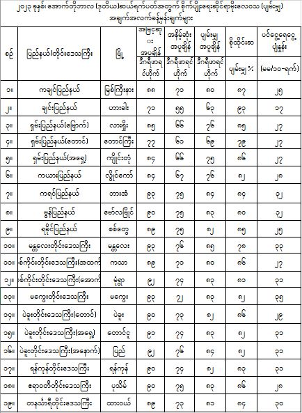 ၂၀၂၃ ခုနှစ်၊ အောက်တိုဘာလ (ပထမ)ဆယ်ရက်ပတ်အတွင်း မိုးရွာသွန်းမှုအခြေအနေများမှာ- စစ်ကိုင်းတိုင်း ဒေသကြီးအောက်ပိုင်း၊ ချင်းပြည်နယ်နှင့် ရှမ်းပြည်နယ်အရှေ့ပိုင်းတို့တွင် အောက်တိုဘာလ (ပထမ)ဆယ်ရက်ပတ်၏ ပျမ်းမျှ မိုးရေချိန်ခန့်သာရှိခဲ့ပြီး၊ ပဲခူးတိုင်းဒေသကြီး၊ ရန်ကုန်တိုင်းဒေသကြီး၊ ဧရာဝတီတိုင်းဒေသကြီး ၊တနင်္သာရီတိုင်းဒေသကြီး၊ ရှမ်းပြည်နယ် (မြောက်ပိုင်းနှင့်တောင်ပိုင်း)၊ ရခိုင်ပြည်နယ်၊ ကယားပြည်နယ်၊ ကရင်ပြည်နယ်နှင့် မွန်ပြည်နယ်တို့တွင် အောက်တိုဘာလ (ပထမ)ဆယ်ရက်ပတ်၏ ပျမ်းမျှမိုးရေချိန်တို့ထက် ပိုခဲ့ကာ၊ စစ်ကိုင်းတိုင်း ဒေသကြီးအထက်ပိုင်း၊ မန္တလေးတိုင်းဒေသကြီး၊ မကွေးတိုင်းဒေသကြီးနှင့် ကချင်ပြည်နယ်တို့တွင် အောက်တိုဘာလ (ပထမ)ဆယ်ရက်ပတ်၏ ပျမ်းမျှ မိုးရေချိန်တိုအောက် လျော့နည်းခဲ့ပါသည်။