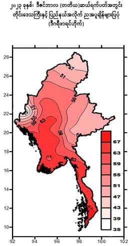 ၂၀၂၃ ခုနှစ်၊ ဒီဇင်ဘာလ (တတိယ)ဆယ်ရက်ပတ်အတွင်း (လေထုစိုထိုင်းဆ) အခြေအနေများမှာ- ရန်ကုန်တိုင်းဒေသကြီး၊ တနင်္သာရီတိုင်းဒေသကြီးနှင့် မွန်ပြည်နယ်တို့တွင် (၅၅%) မှ (၆၆%)အတွင်း၊ မကွေးတိုင်းဒေသကြီး၊ ဧရာဝတီတိုင်းဒေသကြီး၊ ရှမ်းပြည်နယ်(မြောက်ပိုင်းနှင့်တောင်ပိုင်း)နှင့် ကရင်ပြည်နယ်တို့တွင် (၆၇%)မှ (၇၇%) အတွင်း၊ စစ်ကိုင်းတိုင်းဒေသကြီး၊ မန္တလေးတိုင်းဒေသကြီး၊ ပဲခူးတိုင်းဒေသကြီး၊ ကချင်ပြည်နယ်၊ ရှမ်းပြည်နယ်အရှေ့ပိုင်း၊ ရခိုင်ပြည်နယ်နှင့် ကယားပြည်နယ်တို့တွင် (၇၈%)မှ (၈၈%)အတွင်းနှင့် ချင်းပြည်နယ်တွင် (၉၆%) အသီးသီးရှိခဲ့ပါသည်။