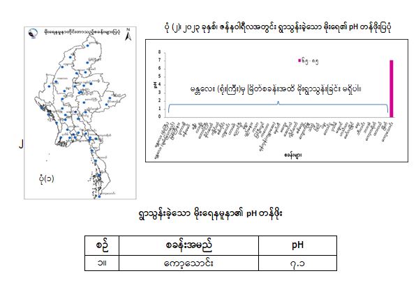 ၂၀၂၃ ခုနှစ်၊ ဇန်နဝါရီလအတွင်း ရွာသွန်းခဲ့သော မိုးရေများ၏ pH တန်ဖိုးနှင့် မိုးရေ၏ Electric Conductivity - EC များကို တိုင်းတာသည့် စခန်း(၄၁)ခုအနက် ကော့သောင်းစခန်းတွင်သာ မိုးရွာသွန်းခဲ့ပြီး၊ ကျန်စခန်းများတွင် မိုးရွာသွန်းခဲ့ခြင်း မရှိဘဲ ကော့သောင်းစခန်းတွင် ရွာသွန်းခဲ့သောမိုးရေ၏ pH တန်ဖိုး သည် ကမ္ဘာ့ကျန်းမာရေးအဖွဲ့ (WHO) မှ စံသတ်မှတ်ထားသည့် သောက်သုံးရေအတွက် pH တန်ဖိုးနှင့် ကျန်းမာရေးဝန်ကြီးဌာနမှ စံသတ်မှတ်ထားသည့် သောက်သုံးရေအတွက် pH တန်ဖိုး (6.5 – 8.5) အတွင်းတွင်ရှိကြောင်း တိုင်းတာရရှိခဲ့သည်။