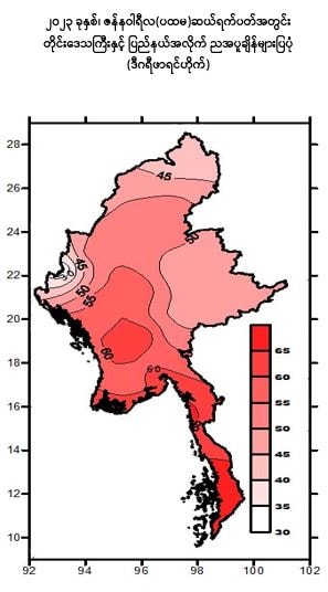 လေထုအတွင်းရေငွေ့ပါဝင်မှုအခြေအနေ---၂၀၂၃ ခုနှစ်၊ ဇန်နဝါရီလ (ပထမ)ဆယ်ရက်ပတ်အတွင်း (လေထုစိုထိုင်းဆ) အခြေအနေများမှာ- ရန်ကုန်တိုင်း ဒေသကြီး၊ ဧရာဝတီတိုင်းဒေသကြီး၊ တနင်္သာရီတိုင်းဒေသကြီး၊ ရှမ်းပြည်နယ်တောင်ပိုင်း၊ ကရင်ပြည်နယ်နှင့် မွန်ပြည်နယ် တို့တွင် (၅၈%)မှ (၆၈%)အတွင်း၊ စစ်ကိုင်းတိုင်းဒေသကြီးအထက်ပိုင်း၊ မန္တလေးတိုင်းဒေသကြီး၊ မကွေးတိုင်းဒေသကြီးနှင့် ပဲခူးတိုင်းဒေသကြီးတို့တွင် (၆၉%)မှ (၇၉%)အတွင်းနှင့် စစ်ကိုင်းတိုင်းဒေသကြီးအောက်ပိုင်း၊ ကချင်ပြည်နယ်၊ ချင်းပြည်နယ်၊ ရှမ်းပြည်နယ်(အရှေ့ပိုင်းနှင့်မြောက်ပိုင်း)၊ ရခိုင်ပြည်နယ်နှင့် ကယားပြည်နယ်တို့တွင် (၈၀%)မှ (၉၀%)အတွင်း အသီးသီးရှိခဲ့ပါသည်။