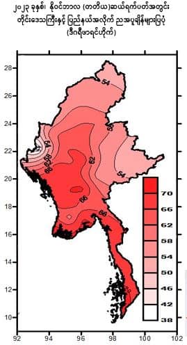 မြူအခြေအနေ-----စစ်ကိုင်းတိုင်းဒေသကြီးအထက်ပိုင်း၊ ကချင်ပြည်နယ်၊ ရှမ်းပြည်နယ်၊ ချင်းပြည်နယ်နှင့် မွန်ပြည်နယ်တို့တွင် (၁၆)ရက်မှ (၂၅)ရက်ခန့်နှင့် နေပြည်တော်၊ စစ်ကိုင်းတိုင်းဒေသကြီးအောက်ပိုင်း၊မန္တလေးတိုင်းဒေသကြီး၊ မကွေးတိုင်းဒေသကြီး၊ ပဲခူးတိုင်းဒေသကြီး၊ ရန်ကုန်တိုင်းဒေသကြီး၊ ဧရာဝတီတိုင်းဒေသကြီး၊ တနင်္သာရီတိုင်းဒေသကြီး၊ ရခိုင်ပြည်နယ်၊ ကယား ပြည်နယ်နှင့် ကရင်ပြည်နယ်တို့တွင် (၅)ရက်မှ (၁၅)ရက်ခန့် နံနက်ပိုင်းတွင် မြုထူများဆိုင်းနိုင်ပါသည်။