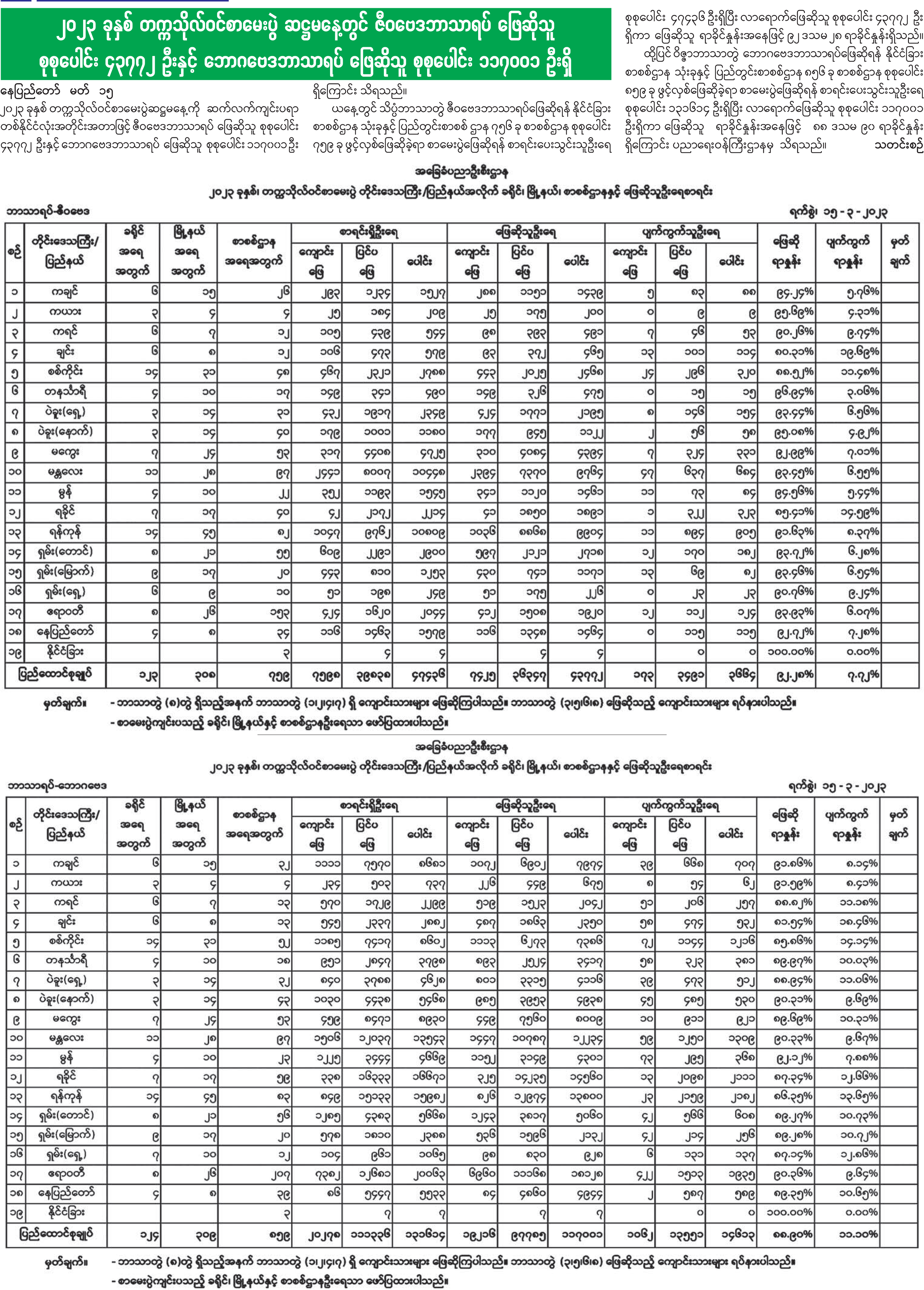 ၂၀၂၃ ခုနှစ် တက္ကသိုလ်ဝင်စာမေးပွဲ ဆဋ္ဌမနေ့တွင် ဇီဝဗေဒဘာသာရပ် ဖြေဆိုသူ စုစုပေါင်း ၄၃၇၇၂ ဦးနှင့် ဘောဂဗေဒဘာသာရပ် ဖြေဆိုသူ စုစုပေါင်း ၁၁၇၀၀၁ ဦးရှိ