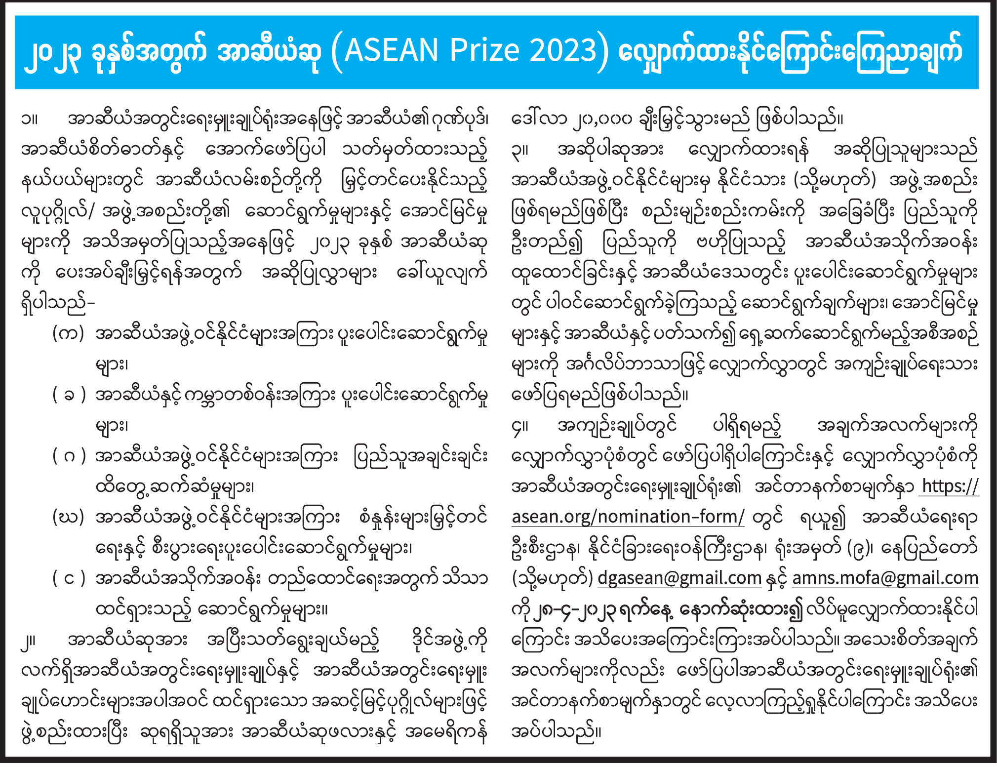 ၂၀၂၃ ခုနှစ်အတွက် အာဆီယံဆု (ASEAN Prize 2023) လျှောက်ထားနိုင်ကြောင်းကြေညာချက်