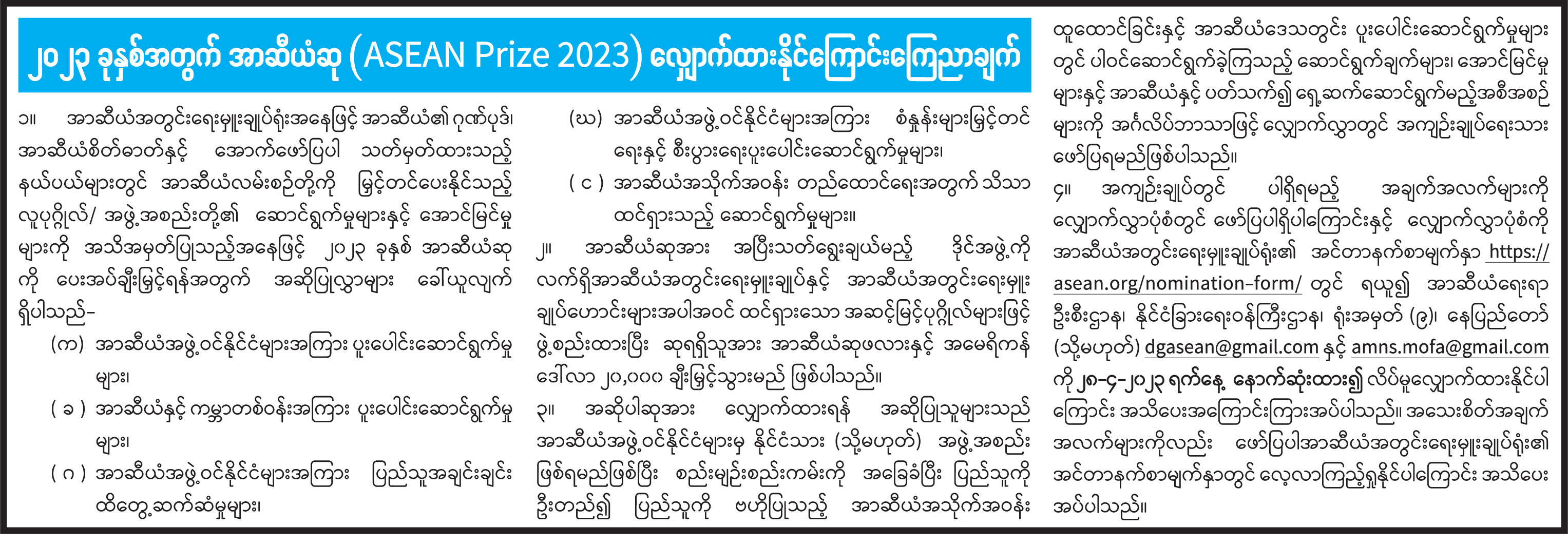 ၂၀၂၃ ခုနှစ်အတွက် အာဆီယံဆု (ASEAN Prize 2023) လျှောက်ထားနိုင်ကြောင်းကြေညာချက်