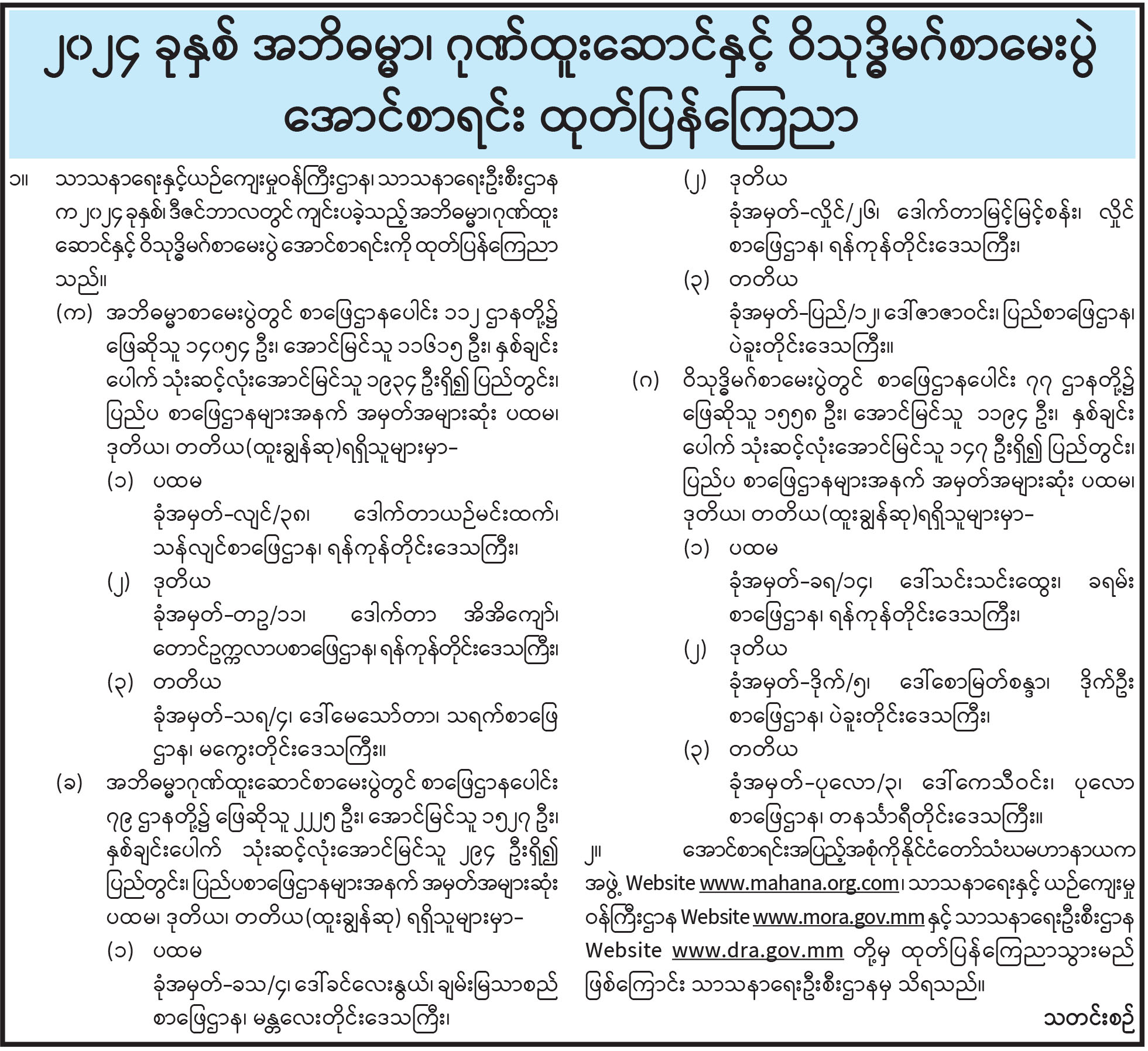 ၂၀၂၄ ခုနှစ် အဘိဓမ္မာ၊ ဂုဏ်ထူးဆောင်နှင့် ဝိသုဒ္ဓိမဂ်စာမေးပွဲ အောင်စာရင်း ထုတ်ပြန်ကြေညာ
