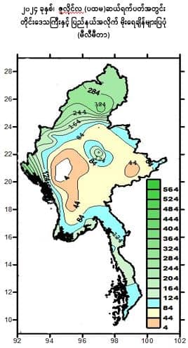 မိုးရွာရက်များအနေဖြင့်- စစ်ကိုင်းတိုင်းဒေသကြီးအထက်ပိုင်း(ခန္တီးမြို့၊ဟုမ္မလင်းမြို့)၊ ရန်ကုန်တိုင်းဒေသကြီး၊ ကချင်ပြည်နယ်၊ ရခိုင်ပြည်နယ်၊ ကရင်ပြည်နယ်နှင့် မွန်ပြည်နယ်(သထုံမြို့)တို့တွင် (၉)ရက်မှ (၁၀)ရက်၊ နေပြည်တော် (ပျဉ်းမနားမြို့)၊ ပဲခူးတိုင်းဒေသကြီး(အရှေ့ပိုင်းနှင့်တောင်ပိုင်း)၊ ဧရာဝတီတိုင်းဒေသကြီး၊ တနင်္သာရီတိုင်းဒေသကြီးနှင့် ချင်းပြည်နယ်တို့တွင် (၇)ရက်မှ (၈)ရက်၊ မန္တလေးတိုင်းဒေသကြီး(မိတ္ထီလာမြို့၊ ရမည်းသင်းမြို့)၊ မကွေးတိုင်းဒေသကြီး (အောင်လံမြို့)နှင့် ရှမ်းပြည်နယ်(မြောက်ပိုင်းနှင့်တောင်ပိုင်း)တို့တွင် (၅)ရက်မှ (၆)ရက်နှင့် စစ်ကိုင်းတိုင်းဒေသကြီးအောက်ပိုင်း၊ ပဲခူးတိုင်းဒေသကြီးအနောက်ပိုင်း၊ ရှမ်းပြည်နယ်အရှေ့ပိုင်းနှင့် ကယားပြည်နယ်တို့တွင် (၂)ရက်မှ (၃)ရက် မိုးထစ်ချုန်းရွာသွန်းခဲ့ပါသည်။