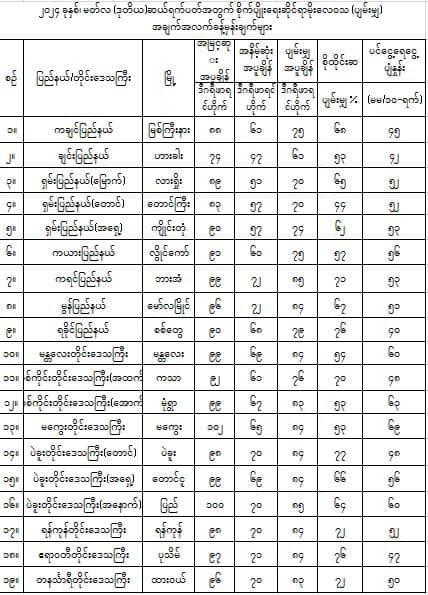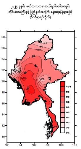 ၂၀၂၄ ခုနှစ်၊ မတ်လ (ပထမ)ဆယ်ရက်ပတ်အတွင်း (ပင်ငွေ့ရေငွေ့ပျံနှုန်း) အခြေအနေများမှာ- ရခိုင်ပြည်နယ်တွင် (၃၈ မီလီမီတာ)အတွင်း၊ ပဲခူးတိုင်းဒေသကြီးတောင်ပိုင်း၊ ဧရာဝတီတိုင်းဒေသကြီး၊ တနင်္သာရီတိုင်းဒေသကြီး၊ ချင်းပြည်နယ်၊ ရှမ်းပြည်နယ်အရှေ့ပိုင်း၊ ကရင်ပြည်နယ်နှင့် မွန်ပြည်နယ်တို့တွင်(၄၂ မီလီမီတာ)မှ (၅၂ မီလီမီတာ) အတွင်း၊ စစ်ကိုင်းတိုင်းဒေသကြီး၊ ပဲခူးတိုင်းဒေသကြီး(အရှေ့ပိုင်းနှင့်အနောက်ပိုင်း)၊ ရန်ကုန်တိုင်းဒေသကြီး၊ ကချင်ပြည်နယ်၊ ရှမ်းပြည်နယ် (မြောက်ပိုင်းနှင့်တောင်ပိုင်း)နှင့် ကယားပြည်နယ်တို့တွင် (၅၃ မီလီမီတာ)မှ (၆၃မီလီမီတာ) အတွင်းနှင့် မန္တလေးတိုင်းဒေသကြီးနှင့် မကွေးတိုင်းဒေသကြီးတို့တွင် (၆၄မီလီမီတာ)မှ (၇၄ မီလီမီတာ)အတွင်း အသီးသီးရှိခဲ့ပါသည်။