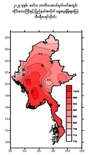 နေပြည်တော်၊ စစ်ကိုင်းတိုင်းဒေသကြီး၊ မန္တလေးတိုင်းဒေသကြီး၊ မကွေးတိုင်းဒေသကြီး၊ ပဲခူးတိုင်းဒေသကြီး၊ ရန်ကုန်တိုင်းဒေသကြီး၊ တနင်္သာရီတိုင်းဒေသကြီး၊ ရှမ်းပြည်နယ်၊ ရခိုင်ပြည်နယ်၊ ကယားပြည်နယ်၊ ကရင်ပြည်နယ်နှင့် မွန်ပြည်နယ်တို့တွင် ဧပြီလ ပျမ်းမျှအပူချိန်၏ (၁.၅)ဒီဂရီဆဲလ်စီးယပ်နှင့်အထက် (သို့မဟုတ်) (၃၅)ဒီဂရီဖာရင်ဟိုက်နှင့်အထက် ပိုနိုင်ပြီး၊ ဧရာဝတီတိုင်းဒေသကြီး၊ ကချင်ပြည်နယ်နှင့် ချင်းပြည်နယ်တို့တွင် ဧပြီလ ပျမ်းမျှအပူချိန်ခန့်သာ ရှိနိုင်ပါသည်။