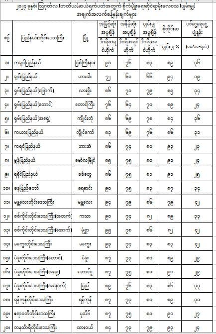 တနင်္သာရီတိုင်းဒေသကြီး၊ ရှမ်းပြည်နယ်တောင်ပိုင်း၊ ရခိုင်ပြည်နယ်၊ ကရင်ပြည်နယ်နှင့် မွန်ပြည်နယ်တို့တွင် (၉)ရက်မှ (၁၀)ရက်၊ စစ်ကိုင်းတိုင်းဒေသကြီးအထက်ပိုင်း (မော်လိုက်မြို့)၊ စစ်ကိုင်းတိုင်းဒေသကြီးအောက်ပိုင်း၊ မန္တလေးတိုင်းဒေသကြီး (ရမည်းသင်းမြို့၊ ပြင်ဦးလွင်မြို့၊ မိတ္ထီလာမြို့)၊ ပဲခူးတိုင်းဒေသကြီး (အရှေ့ပိုင်းနှင့်တောင်ပိုင်း)၊ ရန်ကုန်တိုင်းဒေသကြီး (မှော်ဘီမြို့)၊ ဧရာဝတီတိုင်းဒေသကြီး (ဟင်္သာတမြို့)၊ ကချင်ပြည်နယ် (ပူတာအိုမြို့)၊ ရှမ်းပြည်နယ် (အရှေ့ပိုင်း နှင့်မြောက်ပိုင်း) နှင့် ကယားပြည်နယ်တို့တွင် (၇)ရက်မှ (၈)ရက်နှင့် နေပြည်တော်၊ မကွေးတိုင်းဒေသကြီး၊ ပဲခူးတိုင်းဒေသကြီးအနောက်ပိုင်း (သာယာဝတီမြို့) နှင့် ချင်းပြည်နယ်တို့တွင် (၅)ရက်မှ (၆)ရက် မိုးထစ်ချုန်းရွာသွန်းခဲ့ပါသည်။