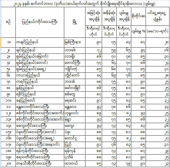 ၂၀၂၄ ခုနှစ်၊ စက်တင်ဘာလ (ပထမ) ဆယ်ရက်ပတ်အတွင်း (လေထုစိုထိုင်းဆ) အခြေအနေများမှာ- နေပြည်တော်၊ စစ်ကိုင်းတိုင်းဒေသကြီး၊ မန္တလေးတိုင်းဒေသကြီး၊ မကွေးတိုင်းဒေသကြီး၊ ပဲခူးတိုင်းဒေသကြီး (အရှေ့ပိုင်းနှင့်အနောက်ပိုင်း)၊ ရန်ကုန်တိုင်းဒေသကြီး၊ ဧရာဝတီတိုင်းဒေသကြီး၊ ကချင်ပြည်နယ်၊ ချင်းပြည်နယ်၊ ရှမ်းပြည်နယ်၊ ရခိုင်ပြည်နယ်နှင့် ကယားပြည်နယ်တို့တွင် (၈၀%)မှ (၉၀%)အတွင်းနှင့် ပဲခူးတိုင်းဒေသကြီးတောင်ပိုင်း၊ တနင်္သာရီတိုင်းဒေသကြီး၊ ကရင်ပြည်နယ်နှင် မွန်ပြည်နယ်တို့တွင် (၉၁ %)မှ (၉၉ %) အတွင်း အသီးသီးရှိခဲ့ပါသည်။