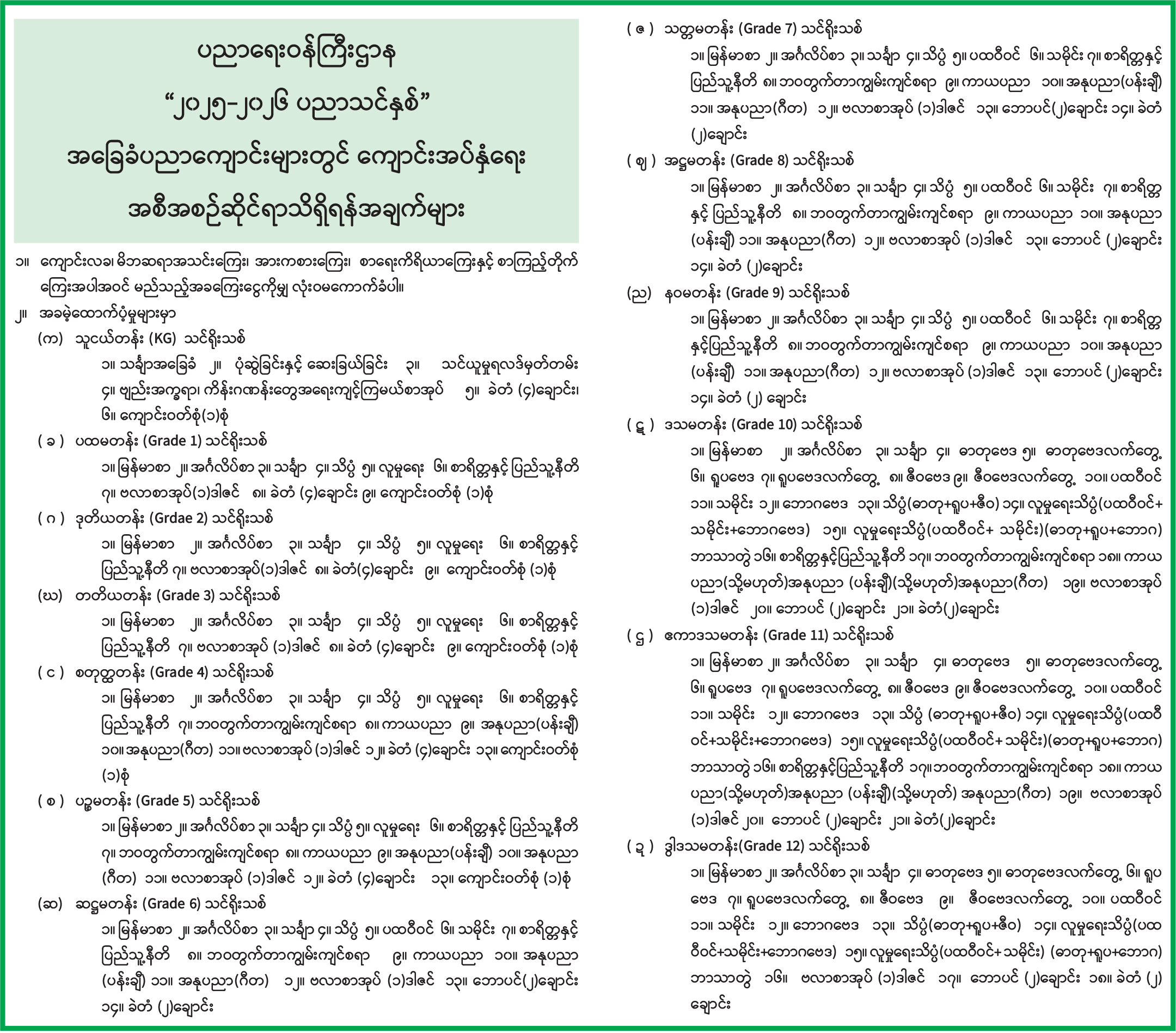 "၂၀၂၅-၂၀၂၆ ပညာသင်နှစ်" အခြေခံပညာကျောင်းများတွင် ကျောင်းအပ်နှံရေး အစီအစဉ်ဆိုင်ရာသိရှိရန်အချက်များ