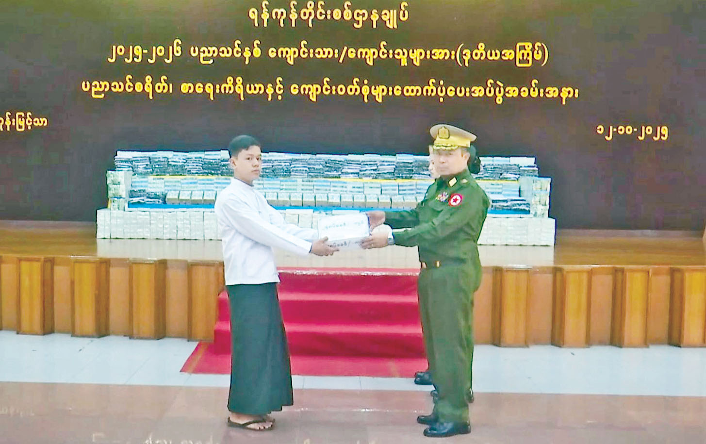 ၂၀၂၅−၂၀၂၆ ပညာသင်နှစ်တွင် တက်ရောက်ပညာသင်ကြားလျက်ရှိသည့် ရန်ကုန်တိုင်းစစ်ဌာနချုပ်နှင့် ကွပ်ကဲမှုအောက် တပ်ရင်း/တပ်ဖွဲ့များမှ တပ်မတော်သားမိသားစုဝင် ကျောင်းသား ကျောင်းသူများအား ဒုတိယအကြိမ် ပညာသင်စရိတ်၊ စာရေးကိရိယာနှင့် ကျောင်းဝတ်စုံများ ပေးအပ်ခြင်းကို ယနေ့နံနက်ပိုင်းတွင် တိုင်းစစ်ဌာနချုပ် အနော်ရထာခန်းမ၌ပြုလုပ်ရာ တိုင်းမှူး ဗိုလ်ချုပ် ပြည့်စုံလင်းနှင့် တာဝန်ရှိသူများ၊ အရာရှိ၊ စစ်သည်၊ မိသားစုများ၊ ကျောင်းသား ကျောင်းသူများ တက်ရောက်ကြသည်။