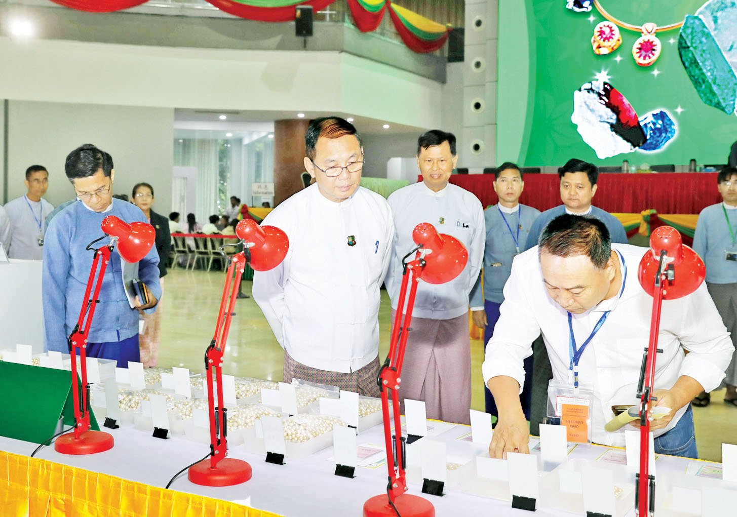 မွန်လွဲပိုင်းတွင် မြန်မာ့ကျောက်မျက်ရတနာပြပွဲ ဗဟိုကော်မတီနာယက၊ သယံဇာတနှင့် သဘာဝပတ်ဝန်းကျင် ထိန်းသိမ်းရေးဝန်ကြီးဌာန ပြည်ထောင်စုဝန်ကြီး ဦးခင်မောင်ရီသည် ပြပွဲကျင်းပရာ မဏိရတနာကျောက်စိမ်းခန်းမ၌ ပုလဲအတွဲများ တင်ဒါဖွင့်ဖောက်စစ်ဆေး၍ ရောင်းချနေမှု၊ မဏိရတနာ ကျောက်စိမ်းခန်းမအတွင်း ပြသထားသည့် ပုလဲအတွဲများ၊ ကျောက်စိမ်းအတွဲများ၊ ကျောက်မျက်အတွဲများ၊ ကျောက်မျက်နှင့် လက်ဝတ်ရတနာ အရောင်းဆိုင်များကို လိုက်လံကြည့်ရှုစစ်ဆေးပြီး လိုအပ်သည်များကို တာဝန်ရှိသူများအား မှာကြားသည်။