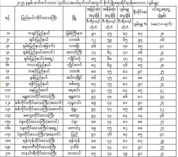 ၂၀၂၅ ခုနှစ်၊ စက်တင်ဘာလ (ပထမ)ဆယ်ရက်ပတ်အတွင်း မိုးရွာသွန်းမှုအခြေအနေများမှာ- မန္တလေးတိုင်းဒေသကြီးနှင့် ချင်းပြည်နယ်တို့တွင် စက်တင်ဘာလ (ပထမ)ဆယ်ရက်ပတ်၏ ပျမ်းမျှမိုးရေချိန်ခန့်သာရှိခဲ့ပြီး၊ နေပြည်တော်၊ ပဲခူးတိုင်းဒေသကြီးအနောက်ပိုင်း၊ တနင်္သာရီတိုင်းဒေသကြီး၊ ကရင်ပြည်နယ်နှင့် ရှမ်းပြည်နယ်တောင်ပိုင်းတို့တွင် စက်တင်ဘာလ (ပထမ)ဆယ်ရက်ပတ်၏ ပျမ်းမျှမိုးရေချိန်တို့ထက်ပိုခဲ့ကာ၊ ရန်ကုန်တိုင်းဒေသကြီး၊ ပဲခူးတိုင်းဒေသကြီး(အရှေ့ပိုင်းနှင့်တောင်ပိုင်း)၊ မကွေးတိုင်းဒေသကြီး၊ စစ်ကိုင်းတိုင်းဒေသကြီး၊ ဧရာဝတီတိုင်းဒေသကြီး၊ ကချင်ပြည်နယ်၊ ကယားပြည်နယ်၊ မွန်ပြည်နယ်၊ ရခိုင်ပြည်နယ်နှင့် ရှမ်းပြည်နယ်(အရှေ့ပိုင်းနှင့်မြောက်ပိုင်း)တို့တွင် စက်တင်ဘာလ (ပထမ)ဆယ်ရက်ပတ်၏ ပျမ်းမျှမိုးရေချိန်တို့အောက် လျော့နည်းခဲ့ပါသည်။