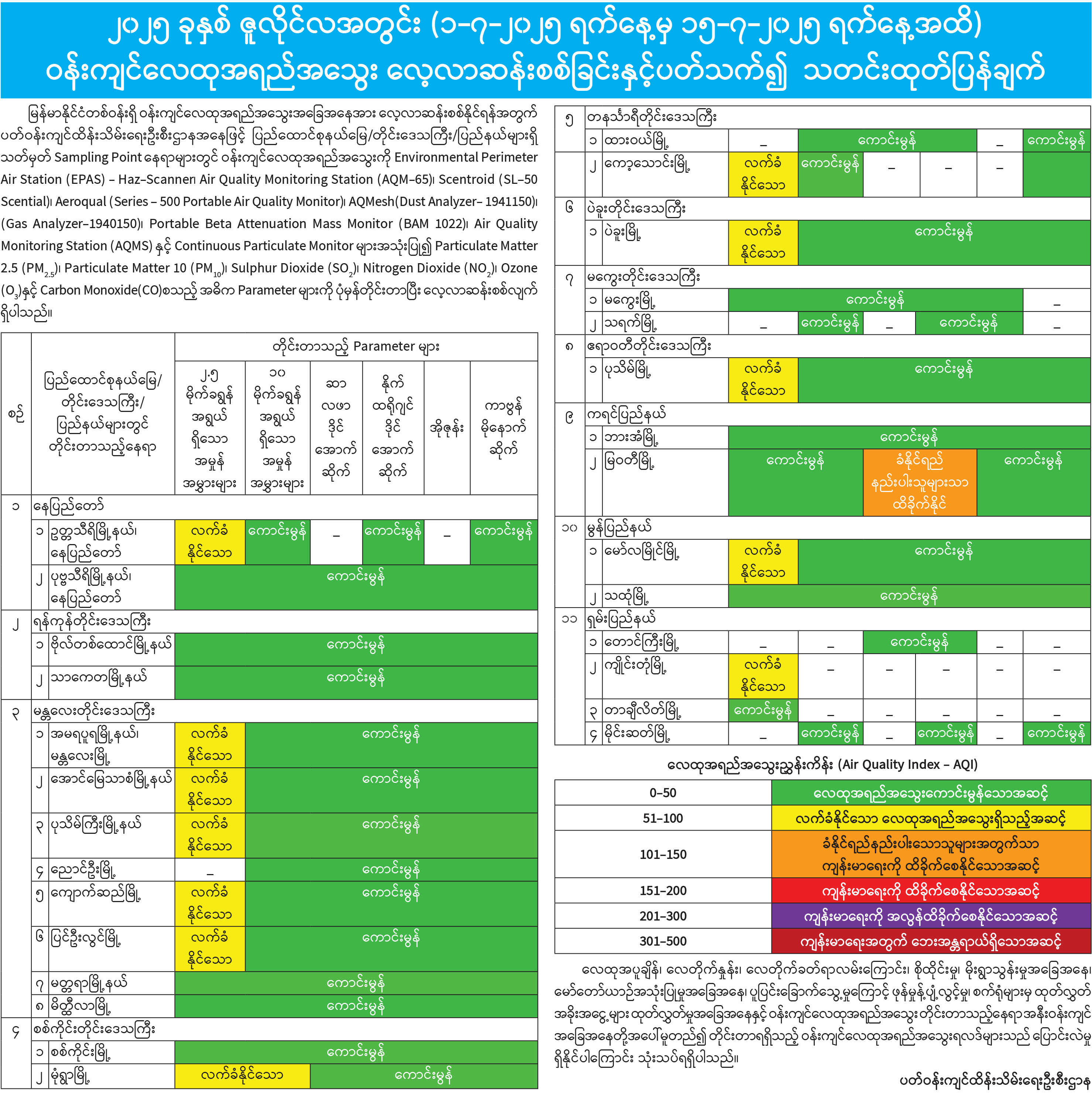 ၂၀၂၅ ခုနှစ် ဇူလိုင်လအတွင်း (၁-၇-၂၀၂၅ ရက်နေ့မှ ၁၅-၇-၂၀၂၅ ရက်နေ့အထိ) ဝန်းကျင်လေထုအရည်အသွေး လေ့လာဆန်းစစ်ခြင်းနှင့်ပတ်သက်၍ သတင်းထုတ်ပြန်ချက်