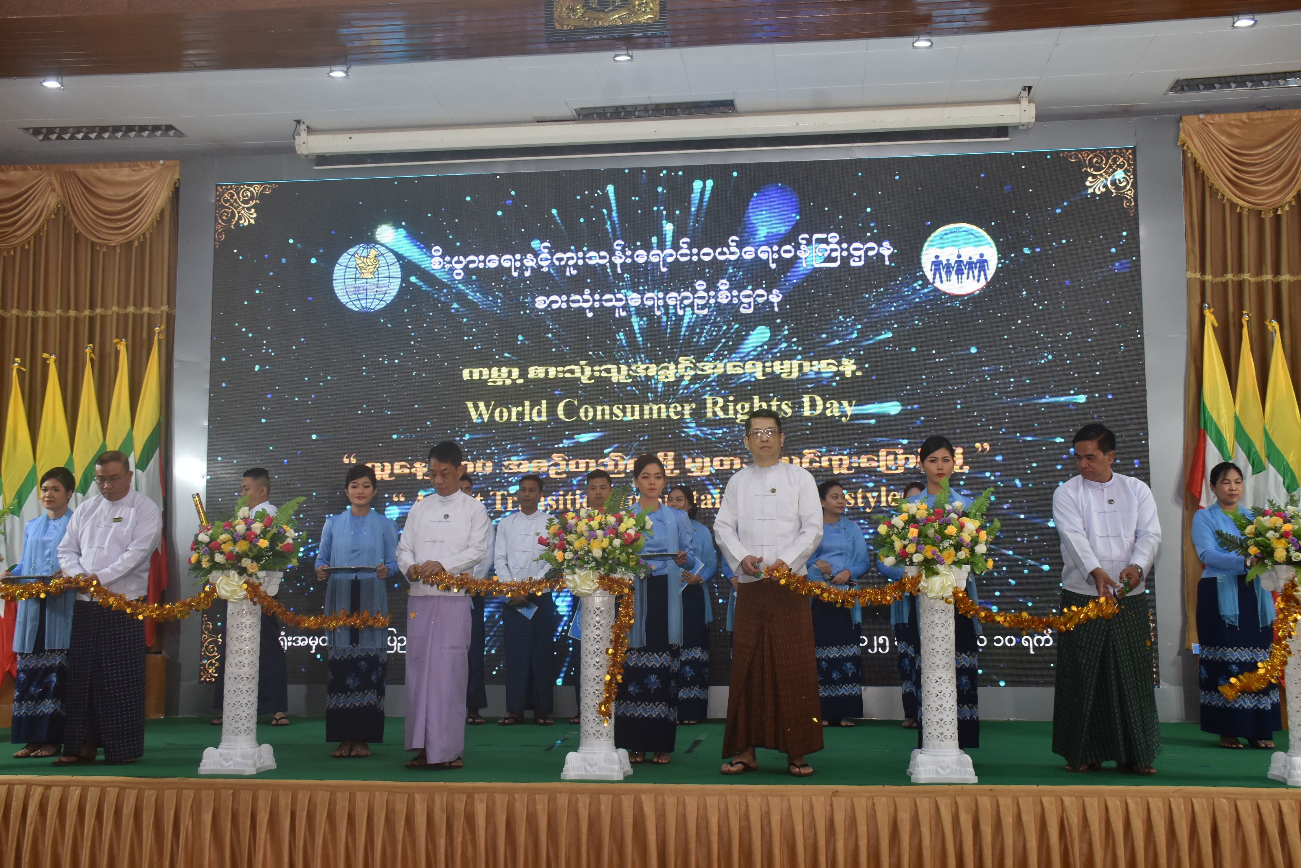 ဉီးစွာ ကမ္ဘာ့စားသုံးသူအခွင့်အရေးများနေ့ (World Consumer Rights Day) အထိမ်းအမှတ် အခမ်းအနားကို ပြည်ထောင်စုဝန်ကြီး၊ ဒုတိယဝန်ကြီးများနှင့် စားသုံးသူရေးရာဦးစီးဌာန ညွှန်ကြား ရေးမှူးချုပ်တို့က ဖဲကြိုးဖြတ်ဖွင့်လှစ်ပေးသည်။