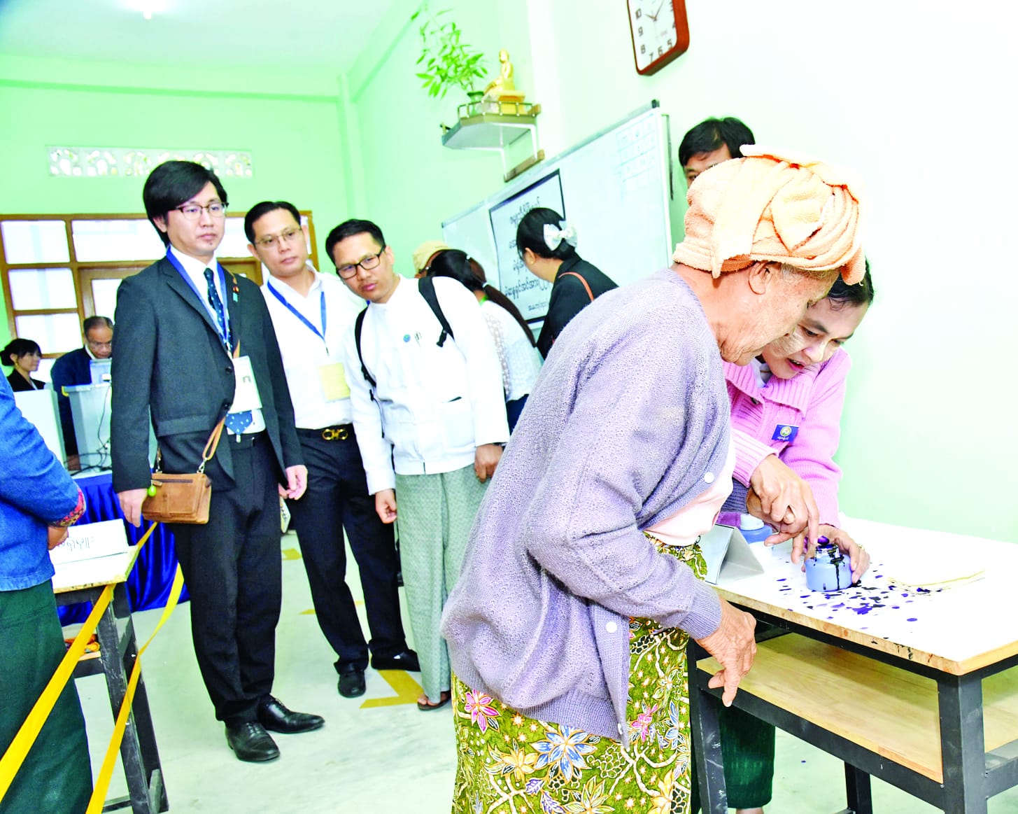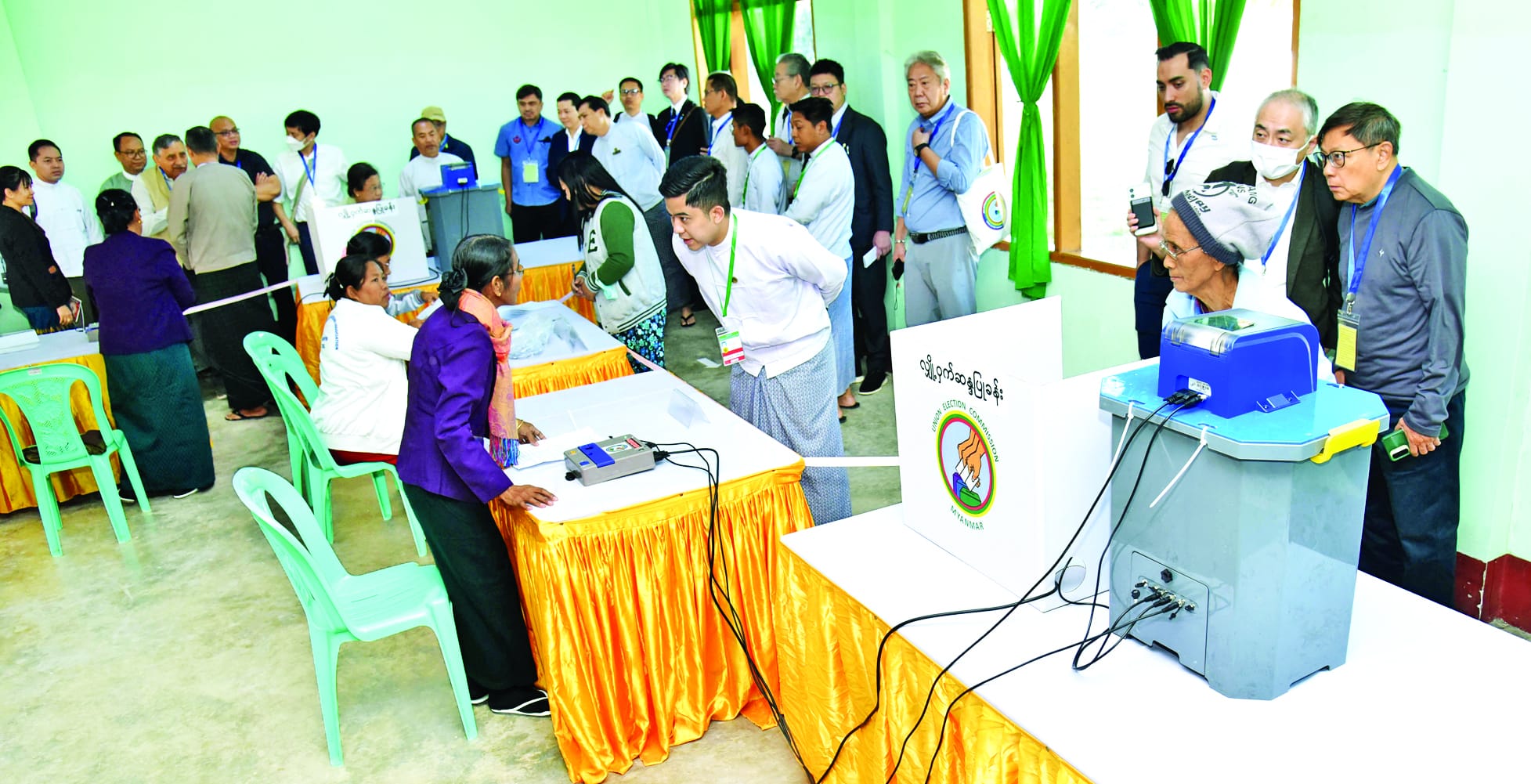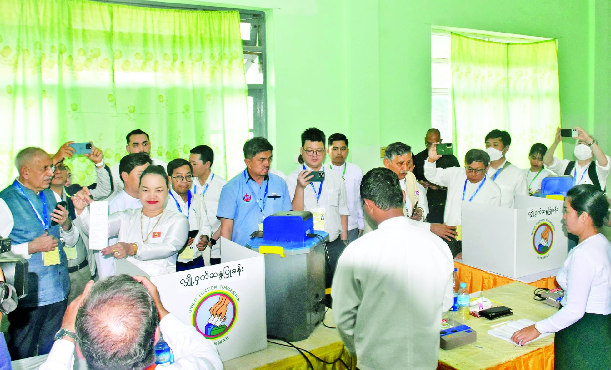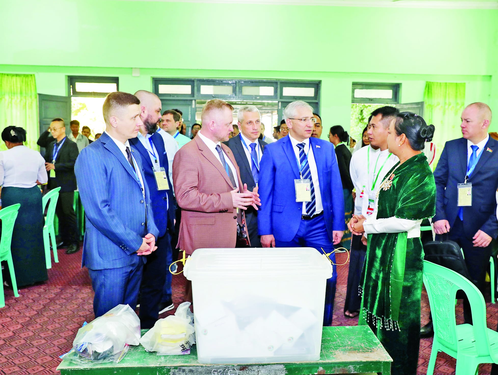 ယနေ့တွင် နိုင်ငံတကာရွေးကောက်ပွဲ စောင့်ကြည့်လေ့လာသူ ရုရှားဖက်ဒရေးရှင်းနိုင်ငံ ဒူးမား လွှတ်တော် ဒုတိယဥက္ကဋ္ဌ H.E Mr. Sholban Kara-Ool ၊ ရုရှား ဖက်ဒရေးရှင်းနိုင်ငံ ဗဟို ရွေးကောက်ပွဲကော်မရှင်အဖွဲ့ဝင် Mr. Igor Borisov ၊ တရုတ်ပြည်သူ့ သမ္မတနိုင်ငံ နိုင်ငံခြားရေးဝန်ကြီးဌာန အာရှရေးရာအထူးကိုယ်စားလှယ် Mr. Deng Xijun နှင့် တရုတ် ကွန်မြူနစ်ပါတီ ဗဟိုကော်မတီ နိုင်ငံတကာရေးရာဌာနမှ Ms. Chen Xuanbo ၊ ဘယ်လာရုစ်သမ္မတနိုင်ငံ ဗဟိုရွေးကောက်ပွဲကော်မရှင် ဒုတိယဥက္ကဋ္ဌ Mr.Alexei Bashan ၊ ကာဇက်စတန်နိုင်ငံ ရွေးကောက်ပွဲကော်မရှင် ဒုတိယဥက္ကဋ္ဌ Mr. Yerman Mukhtar တို့ ဦးဆောင်သော ကိုယ်စားလှယ်အဖွဲ့များသည် ပြည်ထောင်စုရွေးကောက်ပွဲကော်မရှင်အဖွဲ့ဝင် ဦးမျိုးလှိုင်နှင့်အတူ ဇမ္ဗူသီရိမြို့နယ် ရွှေကြာပင်ရပ်ကွက် အထက(၁၄)ရှိ မဲရုံအမှတ်(၁)၊ ပျဉ်းမနားမြို့နယ် ရွာကောက်ရပ်ကွက် မင်္ဂလာဗျူဟာ သာသနာ့ဗိမာန်ရှိ မဲရုံအမှတ်(၂)၊ ပုဗ္ဗသီရိ မြို့နယ် ဇဝနဒီပရပ်ကွက် အထက (၁၃)ရှိ မဲရုံအမှတ်(၁)၊ ပုဗ္ဗသီရိမြို့နယ် နဝဒေးရပ်ကွက် အထက (၂၀)ရှိ မဲရုံအမှတ်(၁)၊ ဇမ္ဗူသီရိမြို့နယ် အောင်ဇမ္ဗူရပ်ကွက် အမက(၁၄၀)ရှိ မဲရုံအမှတ်(၃)နှင့် ပျဉ်းမနားမြို့နယ် ရွာကောက်ရပ်ကွက် အထက(၃)ရှိ မဲရုံအမှတ် (၄)တို့၌ မဲဆန္ဒရှင်ပြည်သူများက မြန်မာအီလက်ထရောနစ် မဲပေးစက်(MEVM) အသုံးပြု၍ ကိုယ်စား လှယ်လောင်းများအား လွတ်လပ်စွာ ဆန္ဒပြုမဲပေးရွေးချယ်နေမှု၊ နိုင်ငံတကာရွေးကောက်ပွဲဆိုင်ရာစံနှုန်းများ၊ အလေ့အကျင့်ကောင်းများနှင့်အညီ လွတ်လပ်၍ တရားမျှတသော ရွေးကောက်ပွဲဖြစ်စေရေး ဆောင်ရွက်လျက်ရှိမှုကို လေ့လာစောင့်ကြည့်ကြပြီး မဲဆန္ဒရှင်များနှင့် မဲရုံမှူးများကိုတွေ့ဆုံ၍ ၎င်းတို့သိရှိလိုသည်များကို မေးမြန်း ဆွေးနွေးကြသည်။