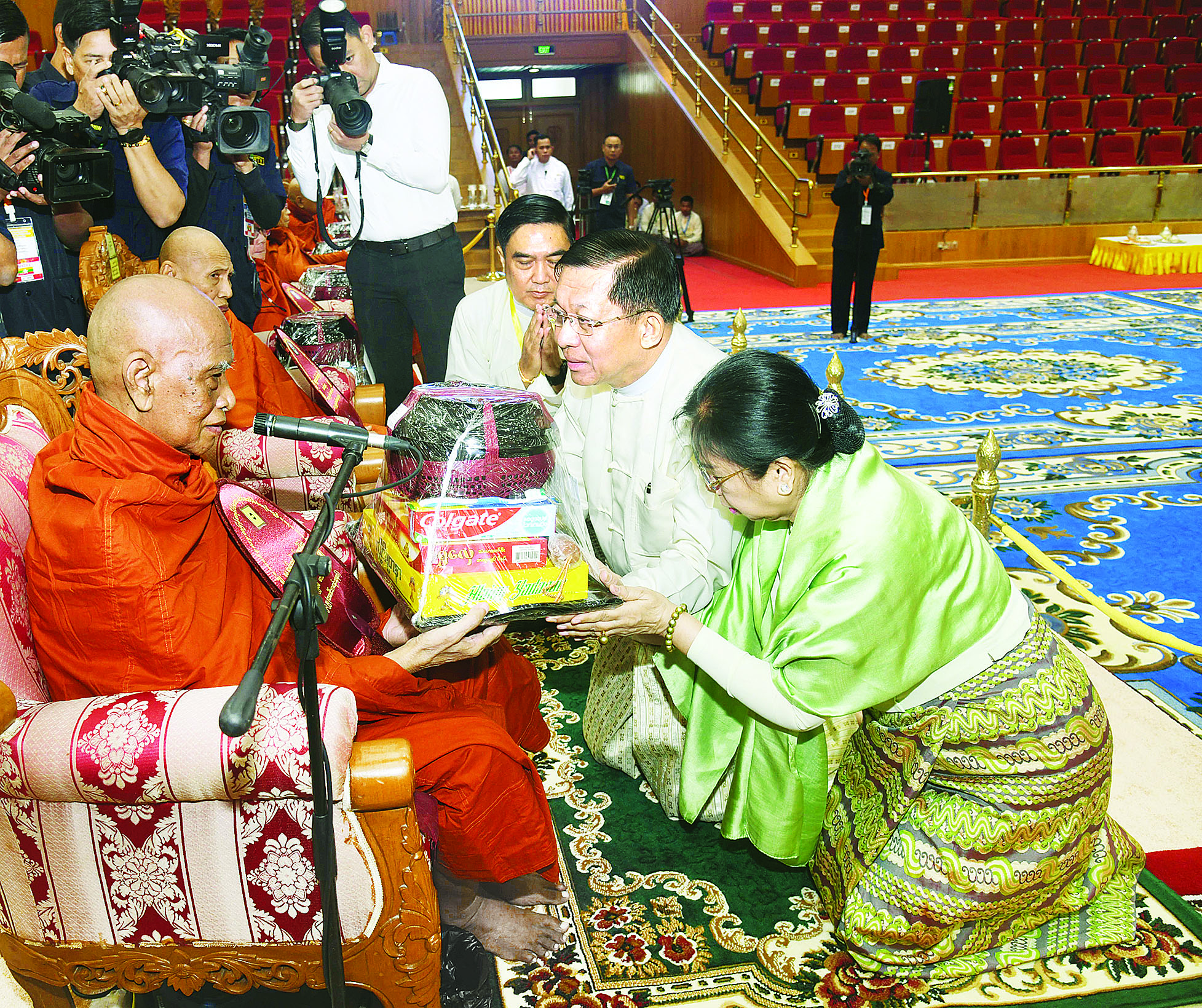 ယင်းနောက် နိုင်ငံတော်စီမံအုပ်ချုပ်ရေးကောင်စီဥက္ကဋ္ဌ နိုင်ငံတော်ဝန်ကြီးချုပ်နှင့်ဇနီးတို့က နိုင်ငံတော်သံဃမဟာ နာယကအဖွဲ့ဥက္ကဋ္ဌ၊ သန်လျင်မင်းကျောင်း ဆရာတော်ဘုရားကြီးထံသို့ လည်းကောင်း၊ ကောင်စီဒုတိယဥက္ကဋ္ဌ ဒုတိယဝန်ကြီးချုပ် နှင့်ဇနီးတို့က နိုင်ငံတော် သံဃမဟာနာယကအဖွဲ့ အကျိုးတော်ဆောင် မန္တလေးမြို့ မစိုးရိမ်တိုက်သစ် မဟာနာယကဆရာတော်ကြီးထံသို့ လည်းကောင်း၊ ကောင်စီ အတွင်းရေးမှူးနှင့်ဇနီး၊ တွဲဖက်အတွင်း ရေးမှူးနှင့်ဇနီး၊ ကောင်စီအဖွဲ့ဝင်များနှင့် ဇနီးများ၊ အခမ်းအနားသို့ တက်ရောက်လာသည့် အကြီးအကဲများက သာသနာ တော်ဆိုင်ရာ ဘွဲ့တံဆိပ်တော် ဆက်ကပ်ခံယူမည့် ဆရာတော်ကြီးများထံသို့လည်းကောင်း လှူဖွယ်ဝတ္ထုပစ္စည်းများကို ဆက်ကပ် လှူဒါန်းကြသည်။