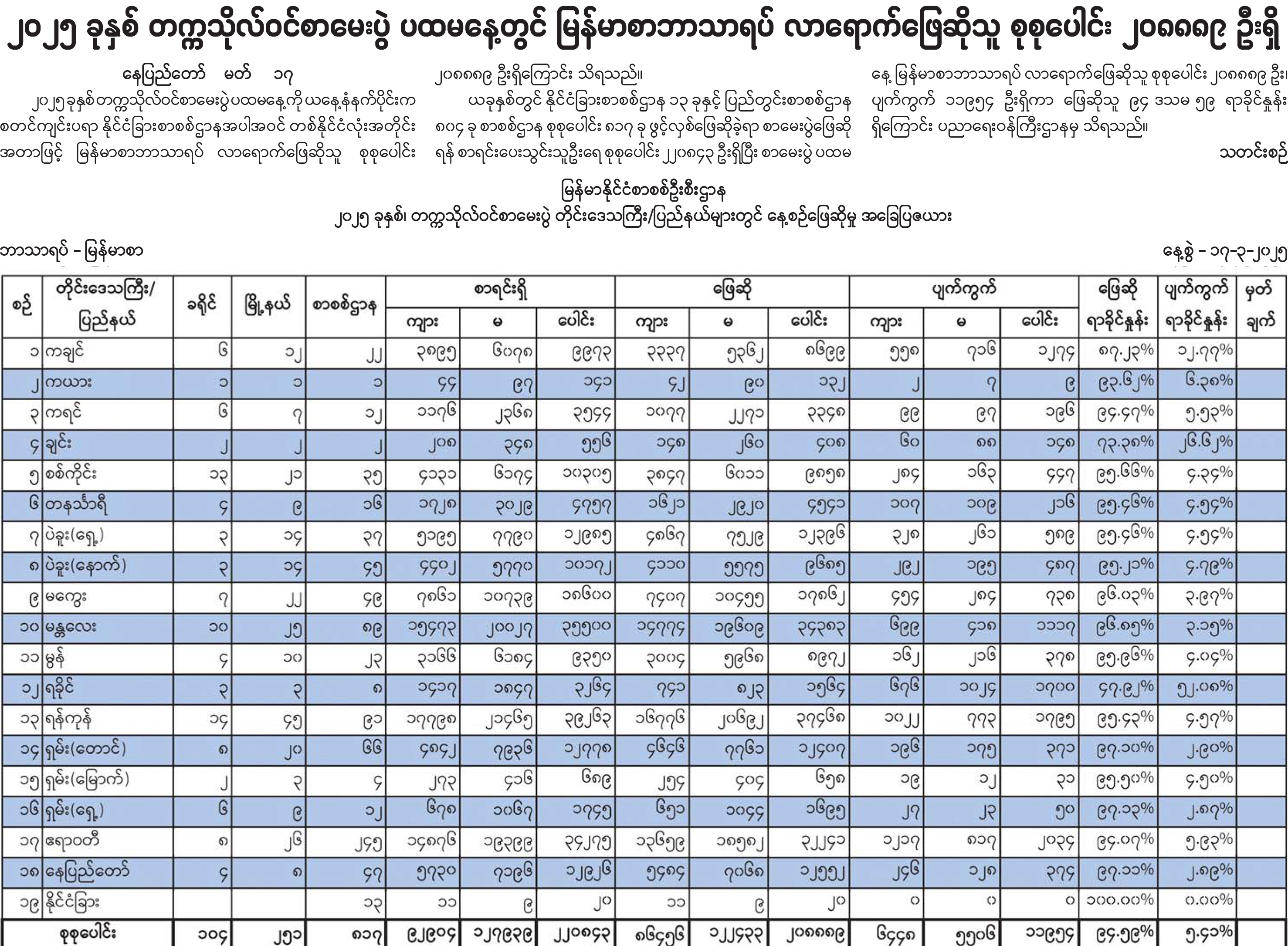 ၂၀၂၅ ခုနှစ် တက္ကသိုလ်ဝင်စာမေးပွဲ ပထမနေ့တွင် မြန်မာစာဘာသာရပ် လာရောက်ဖြေဆိုသူ စုစုပေါင်း ၂၀၈၈၈၉ ဦးရှိ