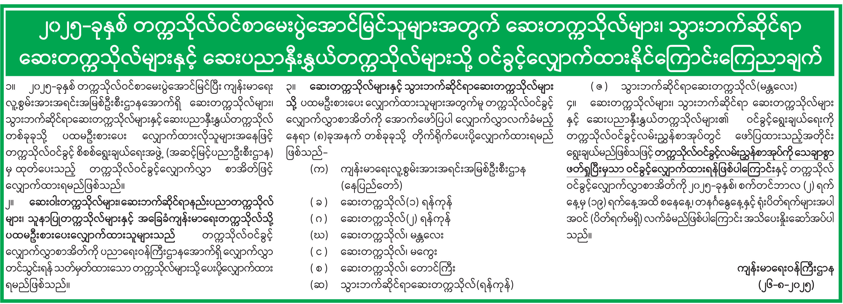 ၂၀၂၅-ခုနှစ် တက္ကသိုလ်ဝင်စာမေးပွဲအောင်မြင်သူများအတွက် ဆေးတက္ကသိုလ်များ၊ သွားဘက်ဆိုင်ရာဆေးတက္ကသိုလ်များနှင့် ဆေးပညာနှီးနွှယ်တက္ကသိုလ်များသို့ ဝင်ခွင့်လျှောက်ထားနိုင်ကြောင်းကြေညာချက်