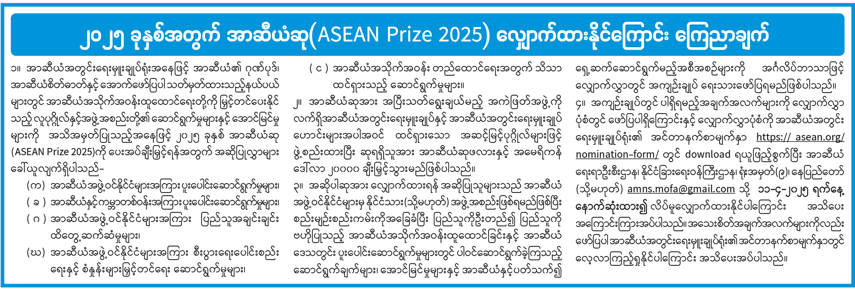 ၂၀၂၅ ခုနှစ်အတွက် အာဆီယံဆု(ASEAN Prize 2025) လျှောက်ထားနိုင်ကြောင်း ကြေညာချက်