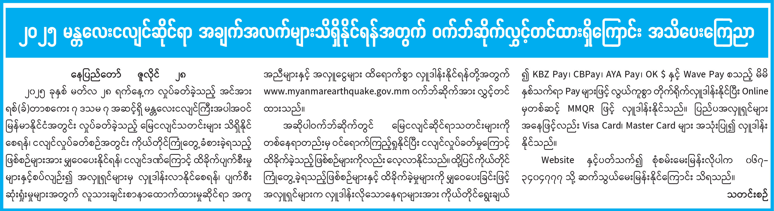 ၂၀၂၅ မန္တလေးငလျင်ဆိုင်ရာ အချက်အလက်များသိရှိနိုင်ရန်အတွက် ဝက်ဘ်ဆိုက်လွှင့်တင်ထားရှိကြောင်း အသိပေးကြေညာ