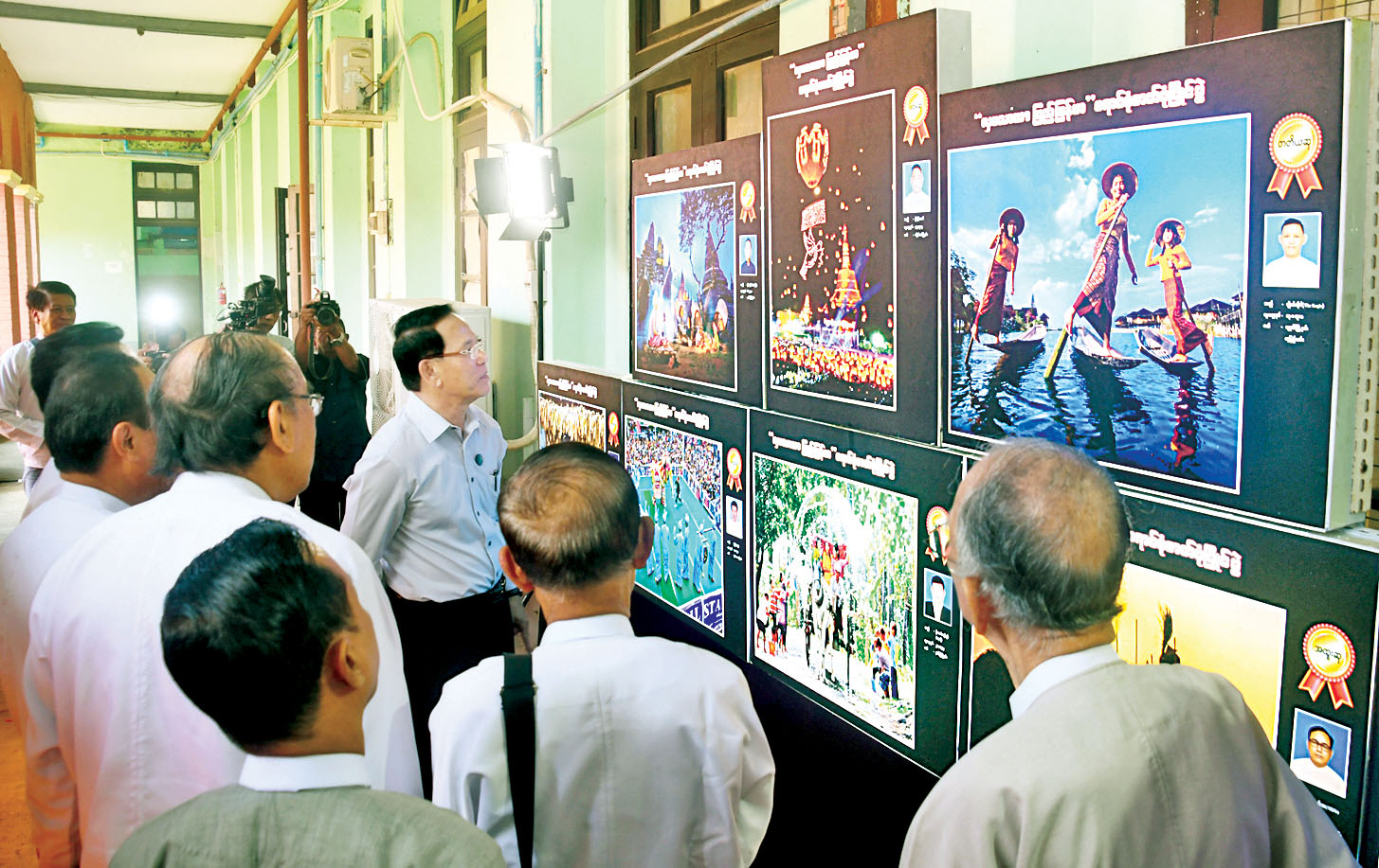 အခမ်းအနားအပြီးတွင် ပြည်ထောင်စုဝန်ကြီးနှင့်အဖွဲ့က ခင်းကျင်းပြသထားသည့် (၇၈)နှစ်မြောက် လွတ်လပ်ရေးနေ့အထိမ်းအမှတ် “လှပသာယာပြည်မြန်မာ” ရောင်စုံဓာတ်ပုံပြိုင်ပွဲဝင်ဓာတ်ပုံများကို ကြည့်ရှုအားပေးကြသည်။