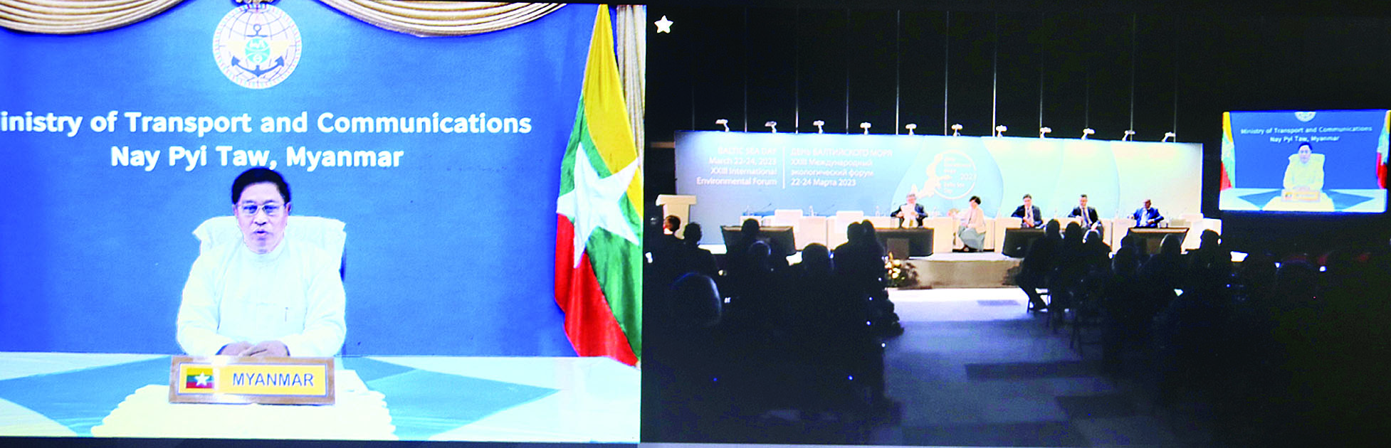 ရုရှားဖက်ဒရေးရှင်းနိုင်ငံ စိန့်ပီတာ စဘတ်အစိုးရအဖွဲ့၏ ဖိတ်ကြား ချက်အရ စိန့်ပီတာစဘတ်မြို့၌ (၂၃) ကြိမ်မြောက် အပြည်ပြည် ဆိုင်ရာ သဘာဝပတ်ဝန်းကျင်ဖိုရမ် နှင့်အတူ ပူးတွဲကျင်းပသည့် “Baltic Sea Day” သို့ ဒုတိယဝန်ကြီးချုပ်နှင့် ပို့ဆောင်ရေးနှင့် ဆက်သွယ်ရေးဝန်ကြီးဌာန ပြည်ထောင်စုဝန်ကြီး ဗိုလ်ချုပ်ကြီး တင်အောင်စန်းသည် ယနေ့ မွန်းလွဲပိုင်းက နေပြည်တော် ပို့ဆောင်ရေးနှင့် ဆက်သွယ် ရေးဝန်ကြီးဌာနမှ online ဖြင့် တက်ရောက်သည်။