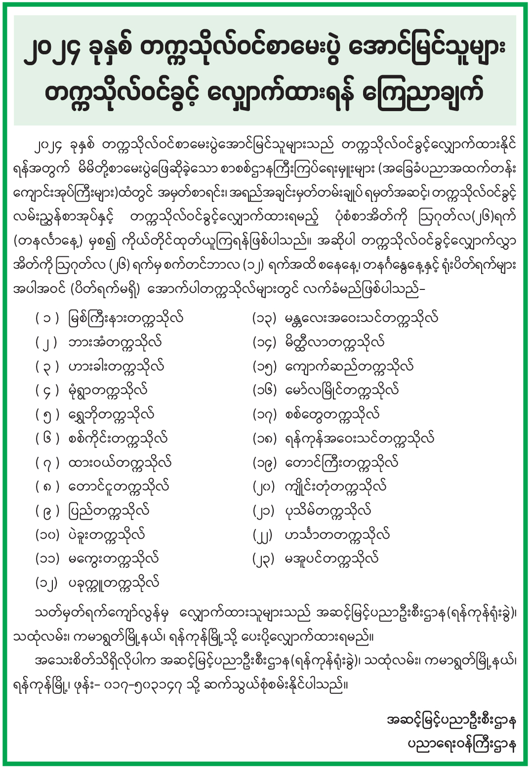 ၂ဝ၂၄ ခုနှစ် တက္ကသိုလ်ဝင်စာမေးပွဲ အောင်မြင်သူများ တက္ကသိုလ်ဝင်ခွင့် လျှောက်ထားရန် ကြေညာချက်