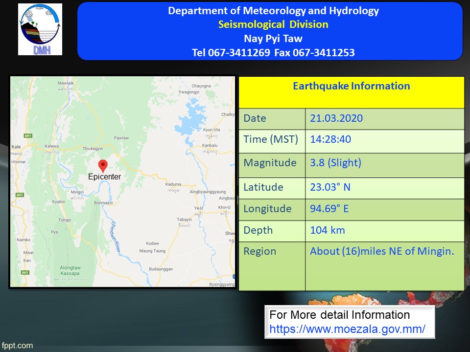 ၂၀၂၀ ပြည့်နှစ်၊ မတ်လ (၂၁)ရက်နေ့၊ မြန်မာစံတော်ချိန် (၁၄)နာရီ၊ (၂၈)မိနစ်၊ (၄၀)စက္ကန့် အချိန်တွင် ကန့်ဘလူမြေငလျင်စခန်းမှ အနောက်-အနောက်တောင်ဘက် (၅၄)မိုင် ခန့်ကွာဝေးသော မြန်မာနိုင်ငံ ပြည်တွင်း (မင်းကင်းမြို့၏ အရှေ့မြောက်ဘက် (၁၆)မိုင် ခန့်အကွာ) မြောက်လတ္တီတွဒ် (၂၃.၀၃)ဒီဂရီ၊ အရှေ့လောင်ဂျီတွဒ် (၉၄.၆၉)ဒီဂရီ၊ အနက်(၁၀၄)ကီလိုမီတာကို ဗဟိုပြု၍ အင်အား ရစ်(ခ်)တာစကေး (၃.၈) အဆင့်ရှိ အင်အားအနည်းငယ်ရှိသော မြေငလျင်တစ်ခု လှုပ်ရှားသွားကြောင်း မိုးဇလမှ တိုင်းထွာ ရရှိကြောင်း ထုတ်ပြန်ထားသည်။