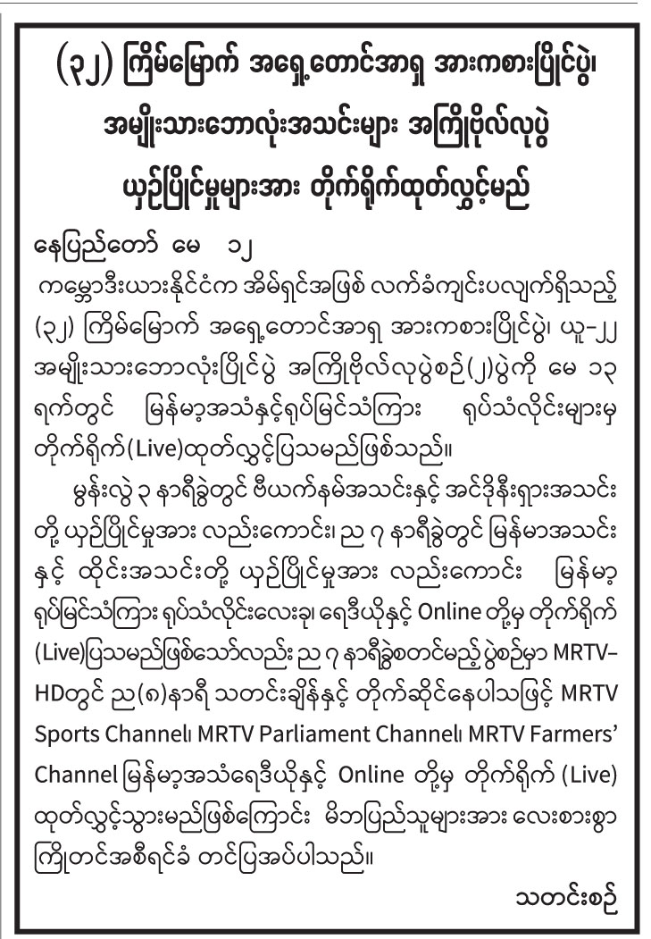 (၃၂) ကြိမ်မြောက် အရှေ့တောင်အာရှ အားကစားပြိုင်ပွဲ၊ အမျိုးသားဘောလုံးအသင်းများ အကြိုဗိုလ်လုပွဲ ယှဉ်ပြိုင်မှုများအား တိုက်ရိုက်ထုတ်လွှင့်မည်
