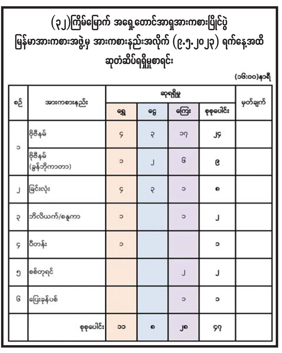 (၃၂) ကြိမ်မြောက် အရှေ့တောင်အာရှ အားကစားပြိုင်ပွဲ မြန်မာအားကစားအဖွဲ့မှ အားကစားနည်းအလိုက် (၉.၅.၂၀၂၃) ရက်နေ့အထိ ဆုတံဆိပ်ရရှိမှုစာရင်း