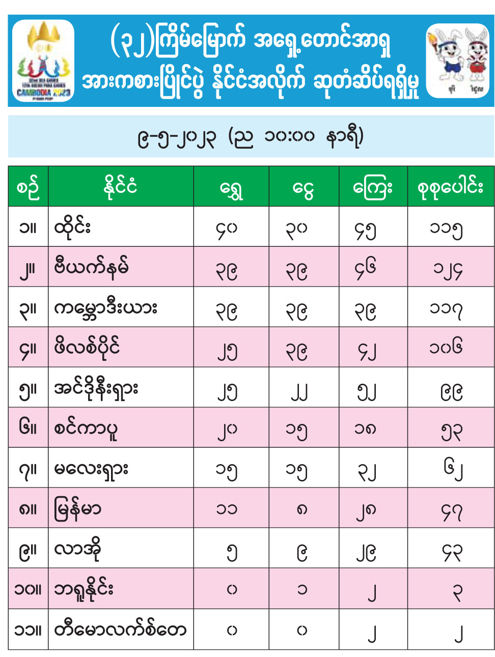 (၃၂) ကြိမ်မြောက် အရှေ့တောင်အာရှ အားကစားပြိုင်ပွဲ နိုင်ငံအလိုက် ဆုတံဆိပ်ရရှိမှု
