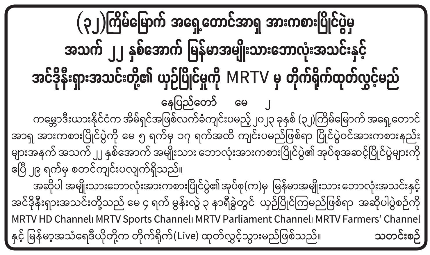 (၃၂) ကြိမ်မြောက် အရှေ့တောင်အာရှ အားကစားပြိုင်ပွဲမှ အသက် ၂၂ နှစ်အောက် မြန်မာအမျိုးသားဘောလုံးအသင်းနှင့် အင်ဒိုနီးရှားအသင်းတို့၏ ယှဉ်ပြိုင်မှုကို MRTV မှ တိုက်ရိုက်ထုတ်လွှင့်မည်