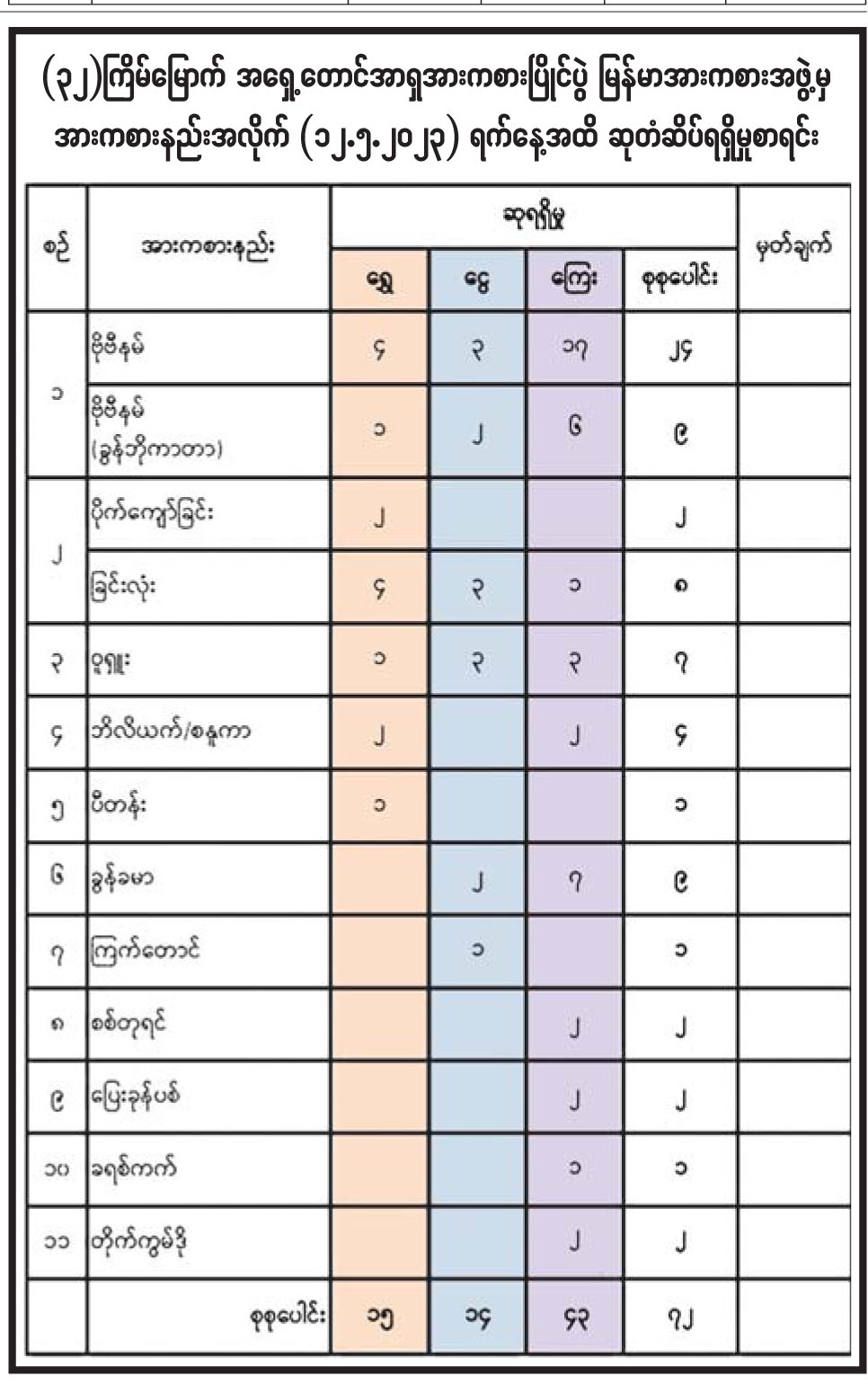 (၃၂) ကြိမ်မြောက် အရှေ့တောင်အာရှအားကစားပြိုင်ပွဲ မြန်မာအားကစားအဖွဲ့မှ အားကစားနည်းအလိုက် (၁၂.၅.၂၀၂၃) ရက်နေ့အထိ ဆုတံဆိပ်ရရှိမှုစာရင်း
