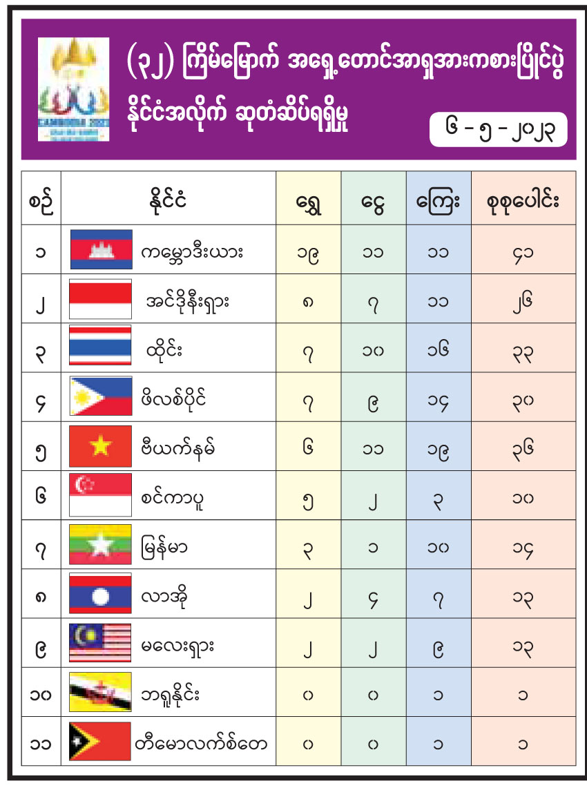 (၃၂) ကြိမ်မြောက် အရှေ့တောင်အာရှအားကစားပြိုင်ပွဲ နိုင်ငံအလိုက် ဆုတံဆိပ်ရရှိမှု