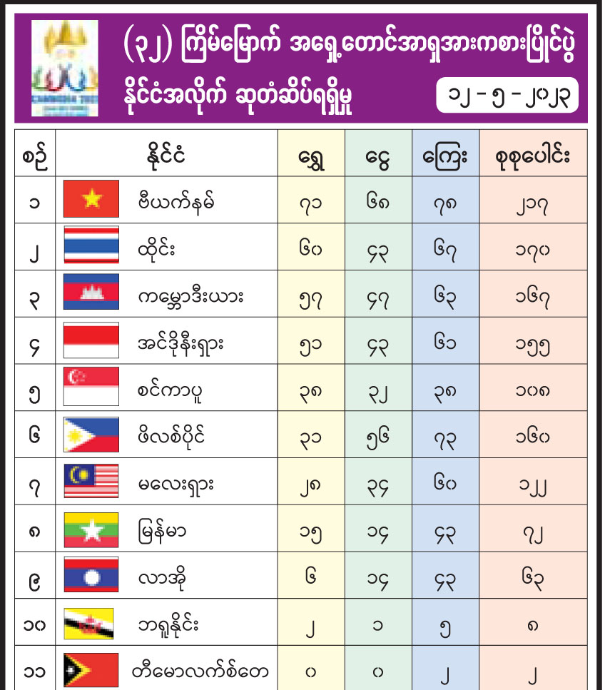 (၃၂) ကြိမ်မြောက် အရှေ့တောင်အာရှအားကစားပြိုင်ပွဲ နိုင်ငံအလိုက် ဆုတံဆိပ်ရရှိမှု
