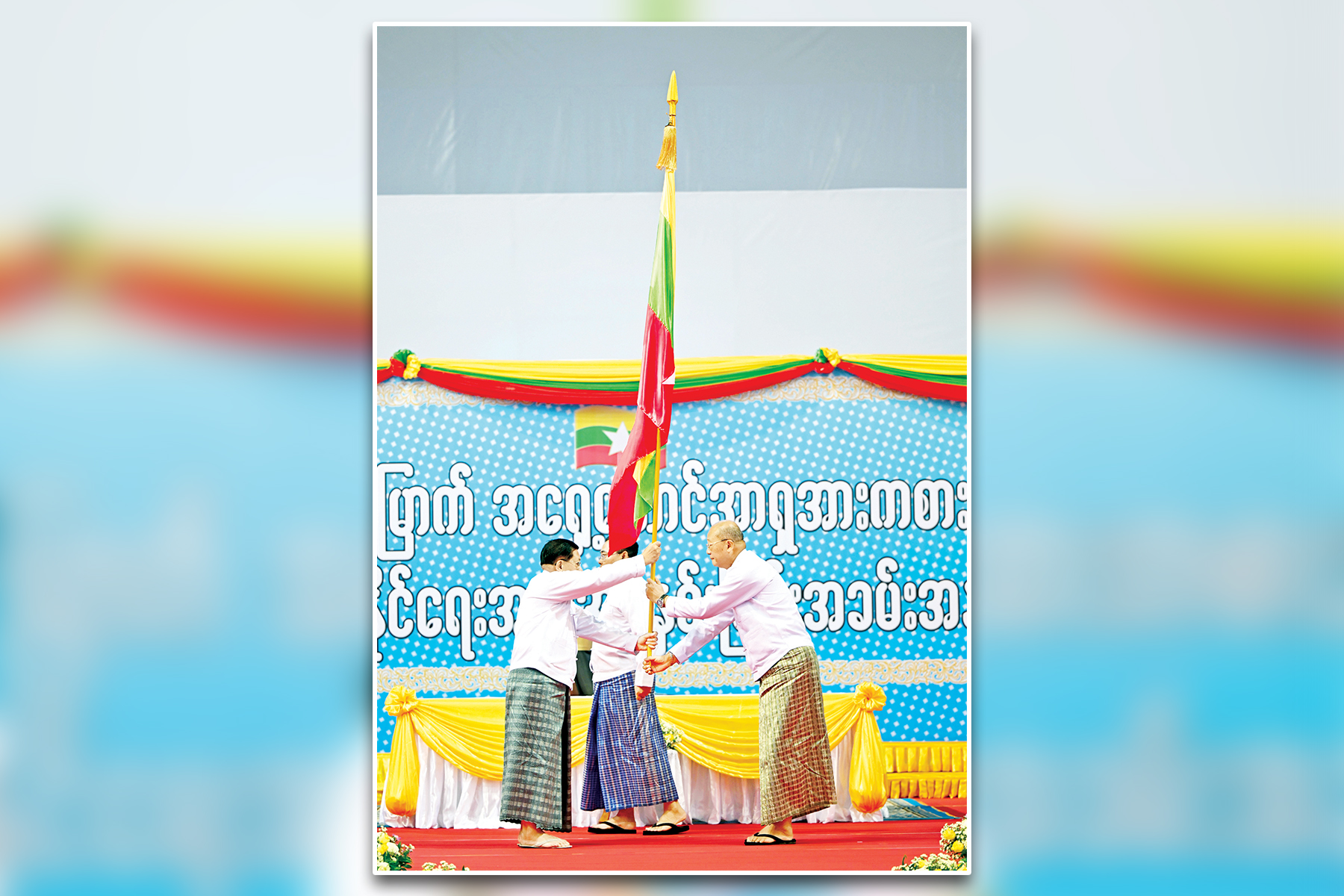 ယင်းနောက် နိုင်ငံတော်ယာယီသမ္မတ နိုင်ငံတော်လုံခြုံရေးနှင့် အေးချမ်းသာယာရေးကော်မရှင် ဥက္ကဋ္ဌက အားကစားနှင့် လူငယ်ရေးရာဝန်ကြီးဌာန ပြည်ထောင်စုဝန်ကြီး Jeng Phang နော်တောင် ထံ (၃၃) ကြိမ်မြောက်အရှေ့တောင်အာရှ အားကစားပြိုင်ပွဲ အောင်နိုင်ရေးအလံအဖြစ် ပြည်ထောင်စု သမ္မတမြန်မာနိုင်ငံတော်အလံကို အပ်နှင်းသည်။