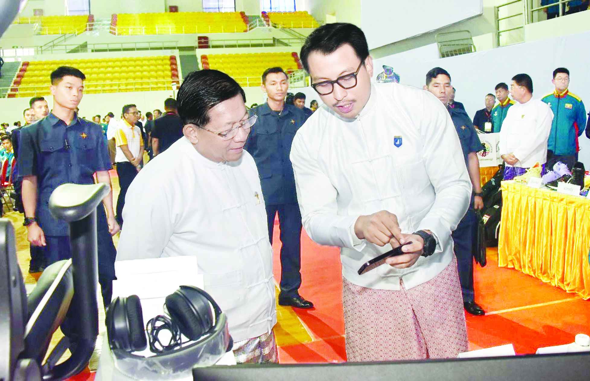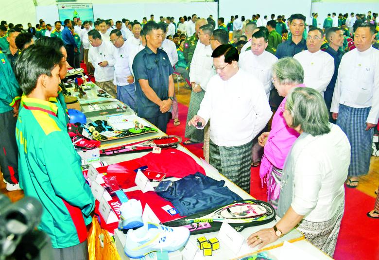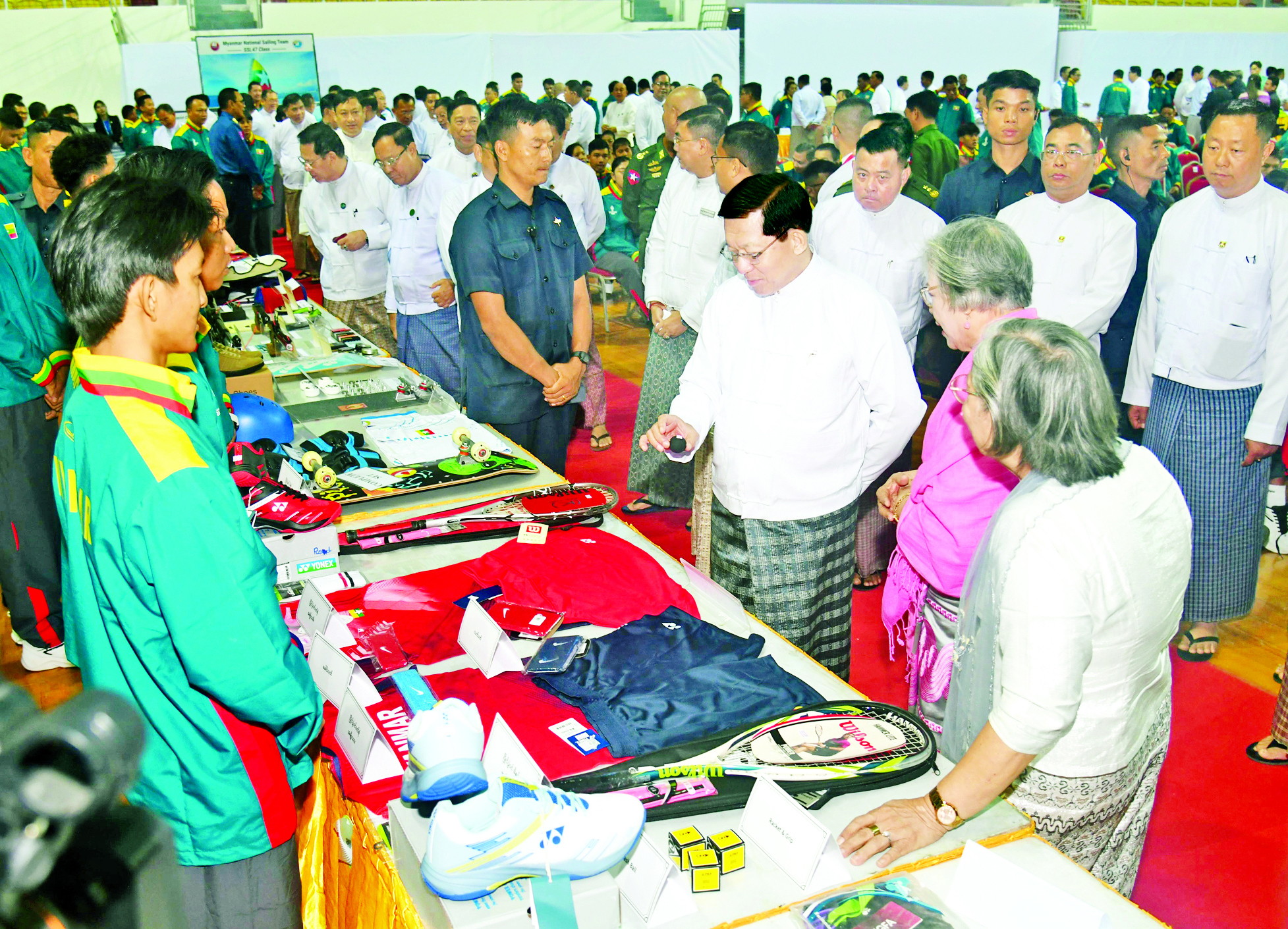 ထို့နောက် နိုင်ငံတော်ယာယီ သမ္မတ နိုင်ငံတော်လုံခြုံရေးနှင့် အေးချမ်းသာယာရေးကော်မရှင် ဥက္ကဋ္ဌက (၃၃) ကြိမ်မြောက် အရှေ့တောင်အာရှ အားကစားပြိုင်ပွဲသို့ ဝင်ရောက်ယှဉ်ပြိုင်မည့် အားကစား အဖွဲ့များအား လိုက်လံနှုတ်ဆက်အားပေးစကားပြောကြားပြီး အားကစားအဖွဲ့များအသုံးပြုမည့် အားကစားနည်းများအလိုက် အသုံးအဆောင်ပစ္စည်းများကို ပြခန်းတစ်ခုချင်းစီအလိုက် လိုက်လံ ကြည့်ရှုစစ်ဆေးကာ တာဝန်ရှိသူများ၏ တင်ပြချက်အပေါ် လိုအပ်သည်များ လမ်းညွှန်မှာကြား ဖြည့်ဆည်း ဆောင်ရွက်ပေးခဲ့ကြောင်း သိရသည်။