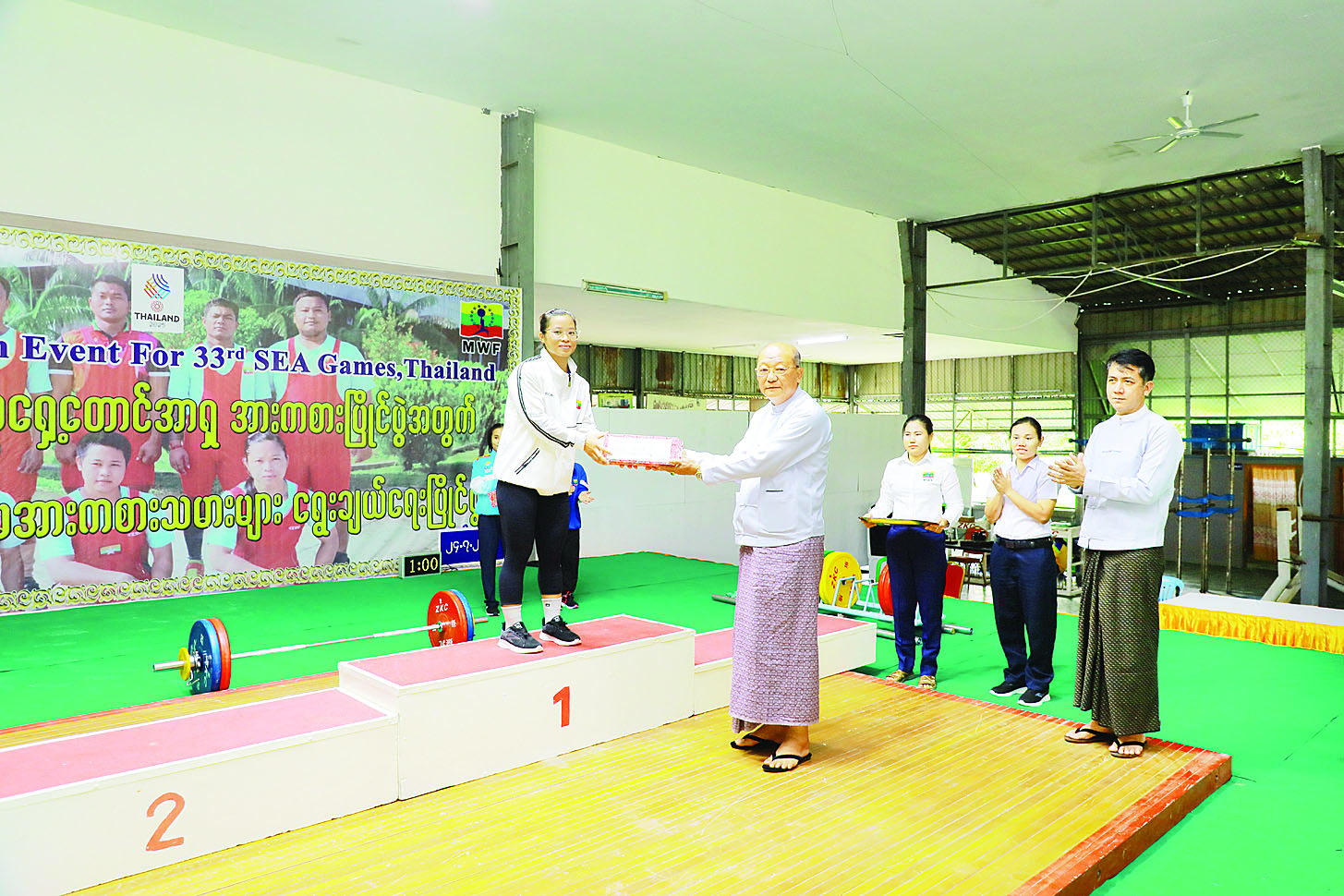 ထို့အတူ အမျိုးသမီး ၄၈ ကီလိုတန်း အမြန်မ၊ နှစ်ဆင့်မနှင့် စုစုပေါင်းပြိုင်ပွဲတွင် သတ်မှတ်စံချိန် ထက်ကျော်ပြီး သာလွန်ကောင်းမွန်အောင် ယှဉ်ပြိုင်နိုင်ခဲ့သည့် နော်အယ်ကညောဂျော့ကို ဒုတိယဝန်ကြီး ဦးဇင်မင်းထက်ကလည်းကောင်း၊ အမျိုးသမီး ၄၈ ကီလိုတန်း နှစ်ဆင့်မပြိုင်ပွဲတွင် သတ်မှတ်စံချိန်ထက် သာလွန်ကောင်းမွန်ပြီး မြန်မာပြည်စံချိန်သစ် တင်နိုင်ခဲ့သည့် ဇင်မေဦး၊ ၆၃ ကီလိုတန်း အမြန်မပြိုင်ပွဲတွင် သတ်မှတ်စံချိန်ထက် သာလွန်ကောင်းမွန်ပြီး မြန်မာပြည် စံချိန်သစ် တင်နိုင်ခဲ့သည့် သူဇာခင်နှင့် အမျိုးသား ၈၈ ကီလိုတန်း နှစ်ဆင့်မပြိုင်ပွဲတို့တွင် သတ်မှတ်စံချိန် ထက် သာလွန်ကောင်းမွန်ပြီး မြန်မာပြည်စံချိန်သစ်တင်နိုင်ခဲ့သည့် ရဲရင့်နိုင်တို့ကို ဒုတိယဝန်ကြီး ဦးထိန်လင်းကလည်းကောင်း၊ အမျိုးသမီး ၅၃ ကီလိုတန်း အမြန်မ၊ နှစ်ဆင့်မနှင့် စုစုပေါင်း ပြိုင်ပွဲတွင် သတ်မှတ်စံချိန်ထက် သာလွန်ကောင်းမွန် ပြီး မြန်မာပြည်စံချိန်သစ် တင်နိုင်ခဲ့သည့် နော်တဘိုးရာ နှင့် အမျိုးသား ၇၉ ကီလိုတန်း နှစ်ဆင့်မပြိုင်ပွဲတွင် သတ်မှတ်စံချိန်ထက် သာလွန်ကောင်းမွန်ပြီး မြန်မာပြည်စံချိန်သစ်တင်နိုင်ခဲ့သည့် သီဟအောင်တို့ကို ပြည်ထောင်စုဝန်ကြီး Jeng Phang နော်တောင်က လည်းကောင်း ဆုများပေးအပ်ချီးမြှင့်သည်။