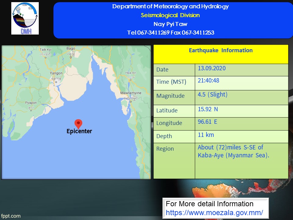 ယနေ့ မြန်မာစံတော်ချိန် ၂၁ နာရီ၊ ၄၀ မိနစ်၊ ၄၈ စက္ကန့်တွင် ကမ္ဘာအေးမြေငလျင်စခန်းမှ တောင်-အရှေ့တောင်ဘက် (၇၂)မိုင်ခန့်ကွာဝေးသော (မြန်မာ့ပင်လယ်ပြင်) မြောက်လတ္တီတွဒ်(၁၅.၉၂)ဒီဂရီ၊ အရှေ့လောင်ဂျီတွဒ် (၉၆.၆၁)ဒီဂရီ၊ အနက်(၁၁)ကီလိုမီတာကို ဗဟိုပြု၍ အင်အားရစ်(ခ်)တာစကေး ၄ ဒသမ ၅ အဆင့်ရှိ အင်အားအနည်းငယ်ရှိသော မြေငလျင်တစ်ခု လှုပ်ရှားသွားကြောင်း တိုင်းထွာရရှိပါသည်။