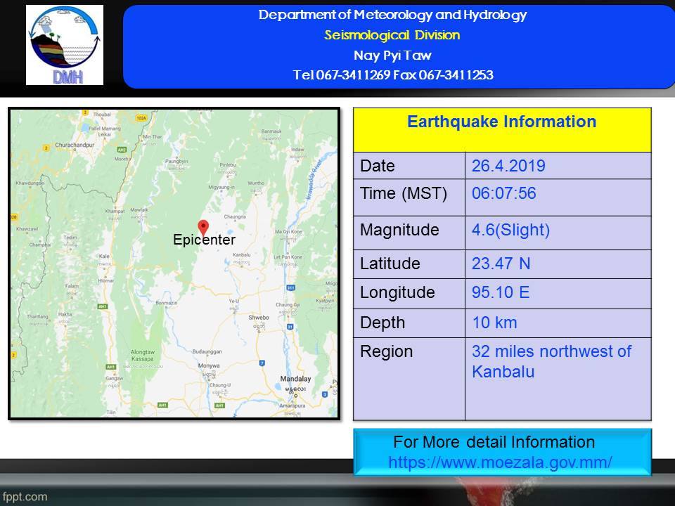 ၂၀၁၉ ခုနှစ် ဧပြီ ၂၆ ရက် မြန်မာစံတော်ချိန် ၆ နာရီ ၇ မိနစ် ၅၆ စက္ကန့်အချိန်တွင် ကန့်ဘလူ မြေငလျင်စခန်းမှ အနောက်မြောက်ဘက် (၃၂) မိုင်ခန့်ကွာဝေးသော မြန်မာနိုင်ငံပြည်တွင်း (ကန့်ဘလူမြို့၏ အနောက်မြောက်ဘက် (၃၂) မိုင်ခန့် အကွာ) မြောက်လတ္တီတွဒ် (၂၃ ဒသမ ၄၇)ဒီဂရီ၊ အရှေ့လောင်ဂျီတွဒ် (၉၅ ဒသမ ၁၀)ဒီဂရီ၊ အနက် (၁၀) ကီလိုမီတာခန့်ကို ဗဟိုပြု၍ အင်အား ရစ်(ခ်)တာစကေး (၄ ဒသမ ၆) အဆင့်ရှိ အင်အားအနည်းငယ်ရှိသော မြေငလျင်တစ်ခု လှုပ်ရှားသွားကြောင်း မိုးလေဝသနှင့် ဇလဗေဒညွှန်ကြားမှုဦးစီးဌာန၏ ထုတ်ပြန်ချက်အရ သိရသည်။