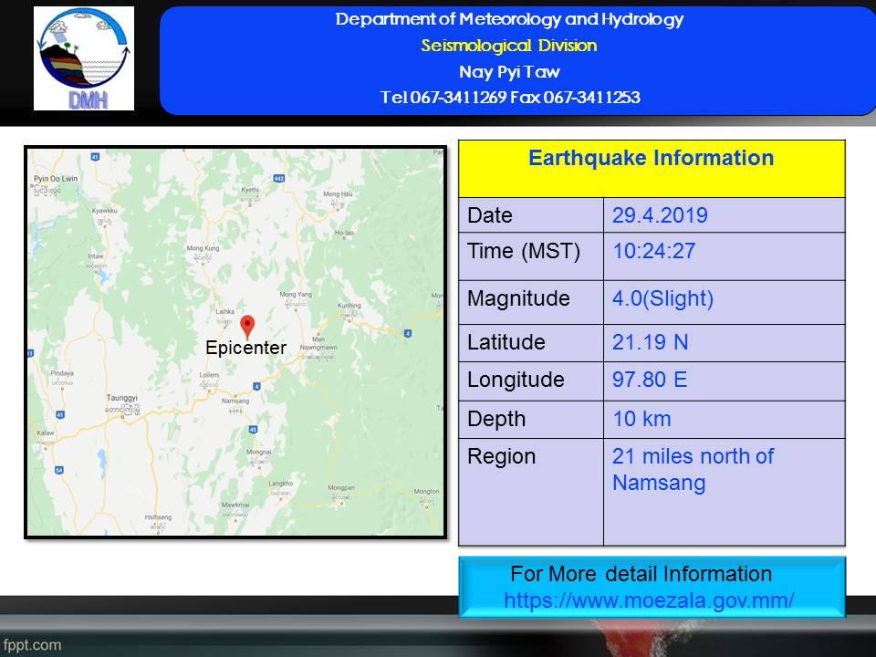ယနေ့နံနက် မြန်မာစံတော်ချိန် ၁၀ နာရီ ၂၄ မိနစ် ၂၇ စက္ကန့်တွင် နမ့်စန်မြေငလျင်စခန်းမှ မြောက်ဘက် (၂၁) မိုင်ခန့်ကွာဝေးသော မြန်မာနိုင်ငံပြည်တွင်း (နမ့်စန်မြို့၏ မြောက်ဘက် (၂၁) မိုင်ခန့်အကွာ) မြောက်လတ္တီတွဒ် (၂၁ ဒသမ ၁၉) ဒီဂရီ၊ အရှေ့လောင်ဂျီတွဒ် (၉၇ ဒသမ ၈၀) ဒီဂရီ၊ အနက် (၁၀) ကီလိုမီတာခန့်ကို ဗဟိုပြု၍ အင်အား ရစ်(ခ်)တာစကေး (၄ ဒသမ ဝ) အဆင့်ရှိ အင်အားအနည်းငယ်ရှိသော မြေငလျင်တစ်ခုလှုပ်ရှားသွားကြောင်း မိုးဝေ၀သနှင့် ဇလဗေဒညွှန်ကြားမှု ဦးစီးဌာန၏ ထုတ်ပြန်ချက်အရ သိရသည်။