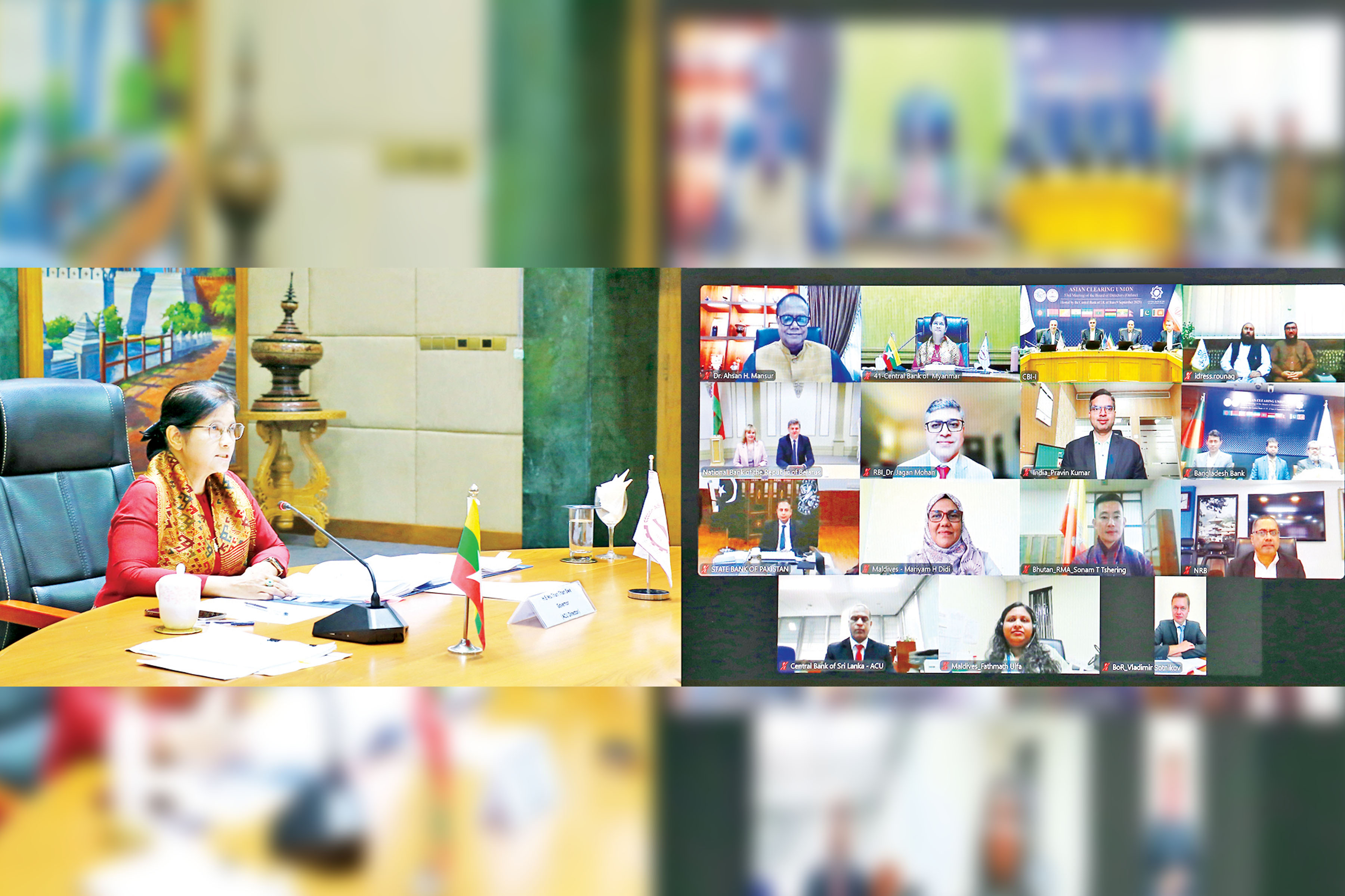 မြန်မာနိုင်ငံတော်ဗဟိုဘဏ်ဥက္ကဋ္ဌ ဒေါ်သန်းသန်းဆွေ ဦးဆောင်သည့်အဖွဲ့သည် ယနေ့မွန်းတည့် ၁၂ နာရီတွင် အိမ်ရှင်နိုင်ငံဖြစ်သည့် အီရန်နိုင်ငံမှ အွန်လိုင်းဖြင့် ကျင်းပသည့် (၅၃) ကြိမ်မြောက် အာရှဗဟိုဘဏ်များ ငွေစာရင်းရှင်းလင်းရေးအဖွဲ့ (အေစီယူ) ဒါရိုက်တာအဖွဲ့အစည်းအဝေးသို့ ဗီဒီယိုကွန်ဖရင့်ဖြင့် တက်ရောက်သည်။